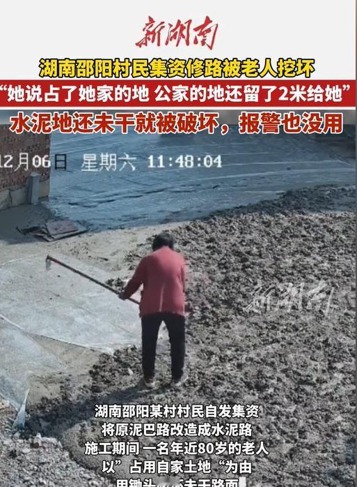 村民集资修路遭八旬妇连砸三小时, 土地纠纷牵扯二十年。 2025年12月湖南某村, 村民凑三万多集资修水泥路,刚浇好就被八旬赵老太用锄头砸了三个小时,路面全毁。 老人说修路占她家地,村里查过1983年土地账本,显示这地是集体所有,还特意把路线挪开了两米避开她家地界。 施工队刚收工,赵老太提着锄头就来挖,水泥还没干就成疙瘩。 村民拦不住,报了四次警,警察来了她就不挖了,人一走又抡起来。 镇里派人带着皮尺和文件来查,找当年分地的人做证,确认这地确实归集体。 现在路没法修了,村民凑的钱快花光,王大爷出门还得拄拐。 赵老太儿子被叫回来,工作组正在算损失,但赵老太还是不同意,天天窝在家里不出门。