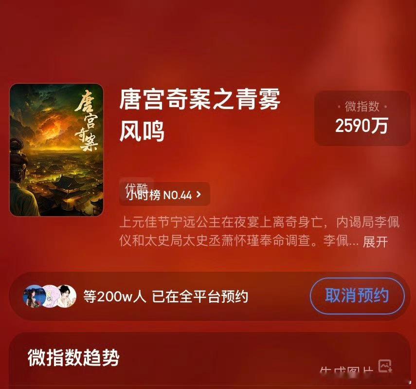 唐宫奇案站内预约破200万白鹿王星越破200万海报 白鹿王星越主演的唐宫奇案站内预约破200万啦,期待住和两位的新剧早点见面啦!