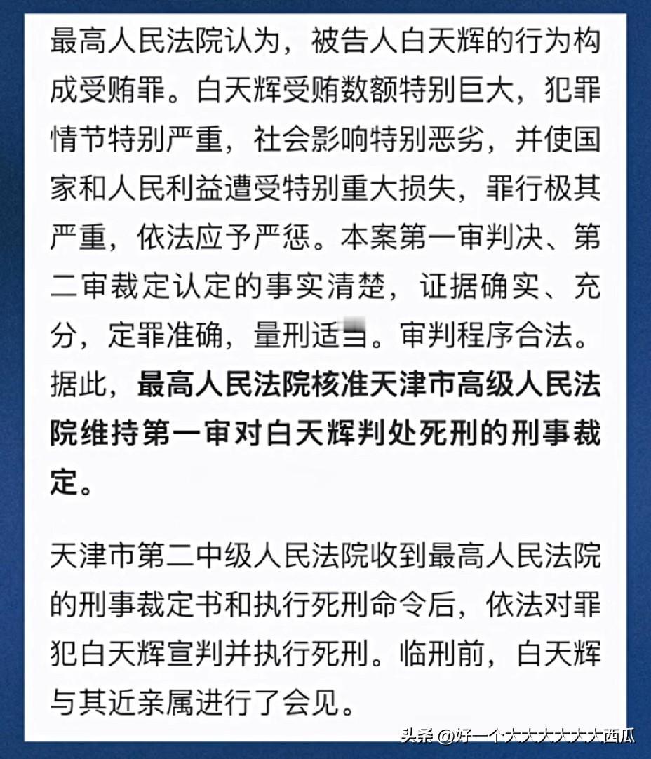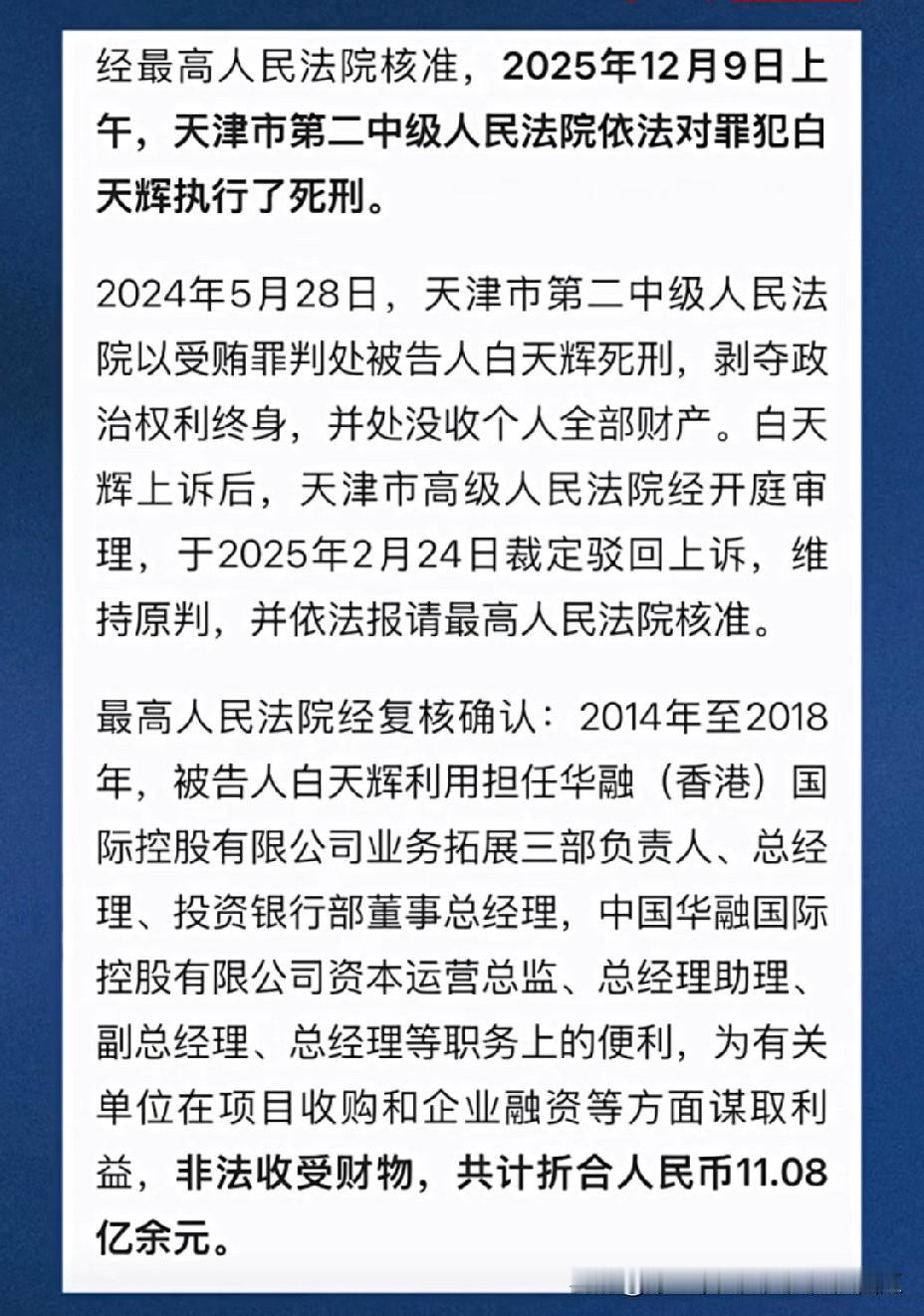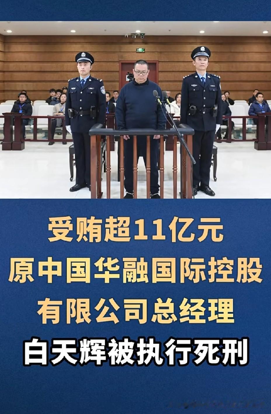 受贿11亿多直接被判死刑, 白天辉被判死刑的最直接原因是对国家和人民利益遭受特别重大的损失, 而且很大可能是大部分钱还没追回来, 这样的蛀虫真的就是该有一个抓一个。 实话实说从这个贪腐的金额来看, 可以想象白天辉当时任华融国际总经理的时候手下权力是有多大, 利益的优惠是有多么的惊人。 华融国际白天辉 白天辉