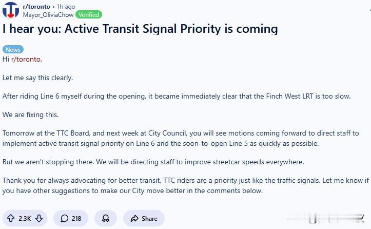 多伦多新轻轨遭民众吐槽,市长邹至蕙放话: 马上提速! 近日,多伦多新开通的轻轨Finch West LRT,遭到大量市民的吐槽。主要原因就是,耗资数十亿的轻轨项目,竟然没有节约大家的通勤时间。 人们在尝试乘坐多伦多新轻轨后纷纷吐槽,速度不如跑步,还得等红灯! 甚至人们表示还是过去的公交更方便。 多伦多市长邹至蕙终于发声了。今日,她在Reddit论坛的多伦多话题下,发布了一条帖子表示,市政府正在行动,要解决轻轨太慢的问题。帖子内容如下: 让我澄清一下。 我自己在开通期间坐了6号线,,立刻就发现Finch West轻轨太慢了。 我们正在解决这个问题。 明天在TTC董事会,以及下周在市议会,你们会看到相关动议,将指示工作人员尽快在6号线和即将开通的5号线上实施主动交通信号优先。 但我们不会就此止步。我们还会指示工作人员提高整个城市有轨电车的速度。 感谢大家一直为更好的交通出声,TTC乘客和交通信号一样都是我们的优先事项。如果你有其他建议让我们城市的交通更顺畅,请在下方评论告诉我。 确实如民众所言,对于多伦多——这座所谓的国际化大都市,如果存在这样一条“等红灯”的慢悠悠的轻轨,真的让人感到深深地难过。