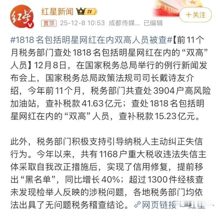 1800+位明星和网红被查 共补税金额高达15.23亿 光鲜镜头背后的“税务游戏”,终于到了清算时刻 这些明星、网红表面光鲜亮丽,收割流量红利,暗地里却投机取巧,在税务当年频频踩雷...真是令人作呕🤑 踩着红利起飞,却漠视责任与公平,本质上是对每一个诚实纳税人的不公。 这次相关单位出手,让这些可耻行径无处可逃,原形毕露👍 也把整个娱乐圈、网红圈对法律的漠视和对金钱的贪婪的,“合理避税”的灰色产业链的遮羞布撕的粉碎。👏 该补的税,一分不能少;该守的法,一条不能越。接下来,谁还在刀尖上跳舞,结局早已写定。 (消息来源:红星新闻)