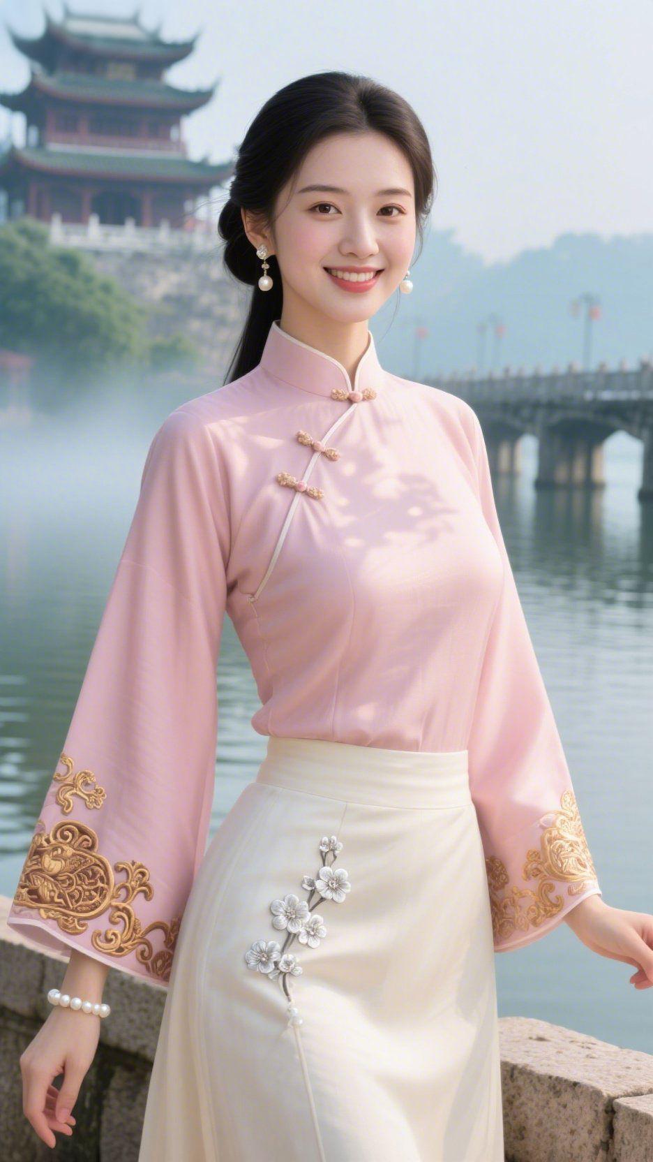 湖岸静 雾岚裹着湖岸的柔意,她衣间的粉白揉着水汽的温软,袖畔的绣纹衬着笑意的舒展,都浸着堤畔的鲜活。 笑涡里的甜是湖风里的柔光,不张扬,只像融在波痕里的暖芒,淡得恰好。没有刻意修饰,只是自然立在石栏旁,便让湖岸的静与衣身的柔,织成了晨雾里妥帖的画面——是粉衣裹着的温和,是湖风栖着的软意,是不经意间漫开的松弛与欢喜。 湖岸温软 粉衣轻帧