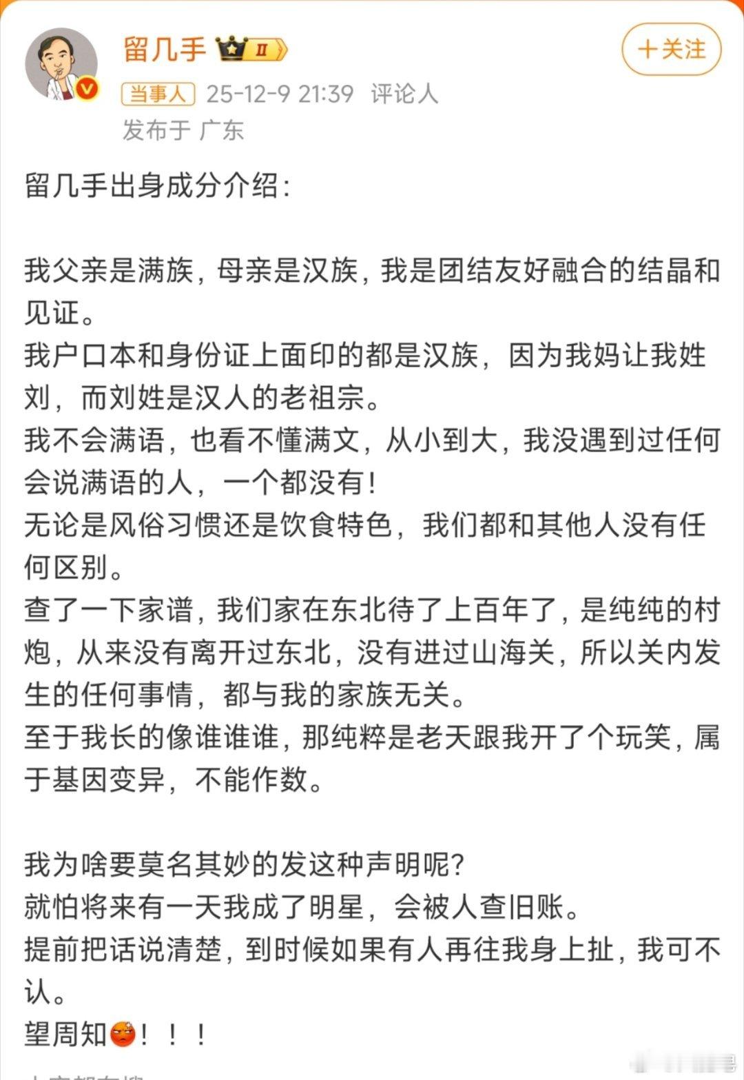 留几手父亲是满族 最近是谁在带这个民族对立的节奏?我知道一点,现在某些组织,他们从各个角度来让我们进行内部矛盾,哎,这种矛盾对立可以是虚无的,也可以是全世界都存在的。所以我也在一直观察到底是哪些人在制造对立……比如之前很火的苹果人安卓人,现在又制造了一个民族对立,这个更严重,我觉得有关部门一定要好好查查,包括可以查一下某些主播直播上来连麦的这些读稿的,他们的稿子哪里来的?是谁给他们灌输的。最近封了几个大V,你们想想这些人是不是都制造过各种角度的对立,当然,没有对立他们怎么火呢是吧?唯一我现在还在纳闷的是,为什么那些制造性别对立的有些头部有些还能美滋滋的?