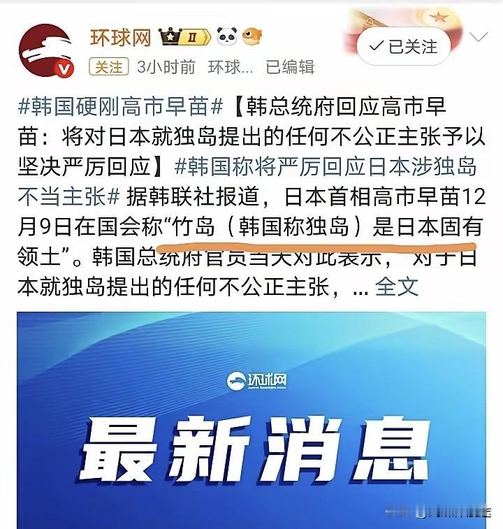 高市再次将茅头指向韩国“独岛”:属于日本领土! 高市早苗12月9日在日本国会答辩时称,不管是从历史还是国际法的角度来说,竹岛(独岛)显然都是日本的固有领土。 日本高市确实是一个“刺头”,胆量真不小, 同时激怒邻国:中国与韩国。 如今看来在东北亚地区 日本到处“树敌”,俄罗斯 韩国 朝鲜 中国 均与日本有曾经的深仇大恨,也有当下的所谓领土之争,更有日本“侵略”邪恶用心,日本真有这么大的胆量 在东北亚搅局吗? 不过从日本胆敢惹上中国与韩国同时,心中依然仗着背后的“美日同盟”,就在当下美国沉默不语的时候,日本政府不断加大搅局的力度,让美国特朗普听得到 看得到日本,就是为了此起美国对日本的关注,为日本说话。以达到日本政府所依赖的“美日同盟关系”生效!将美国拉下水,日本就有胜算了! 不过美国有胆量在东北亚 与俄罗斯 朝鲜 与中国为敌吗?美国特朗普发行的新版《国家国安战略》写得明明白白:没有利益可赚取的活,美国不干的,亏本的生意,特朗普算盘打得精细! 美国的态度也一定让日本失望! 对于日本与韩国领土之争,美国也相当的尴尬,这两个国家都是美国的同盟,美国向谁说话呢? 面对日本政府的领土申索,韩国总统首次回应:独岛是属于韩国,不存在任何领土纠纷,同时驳斥高市涉韩日领土之争!