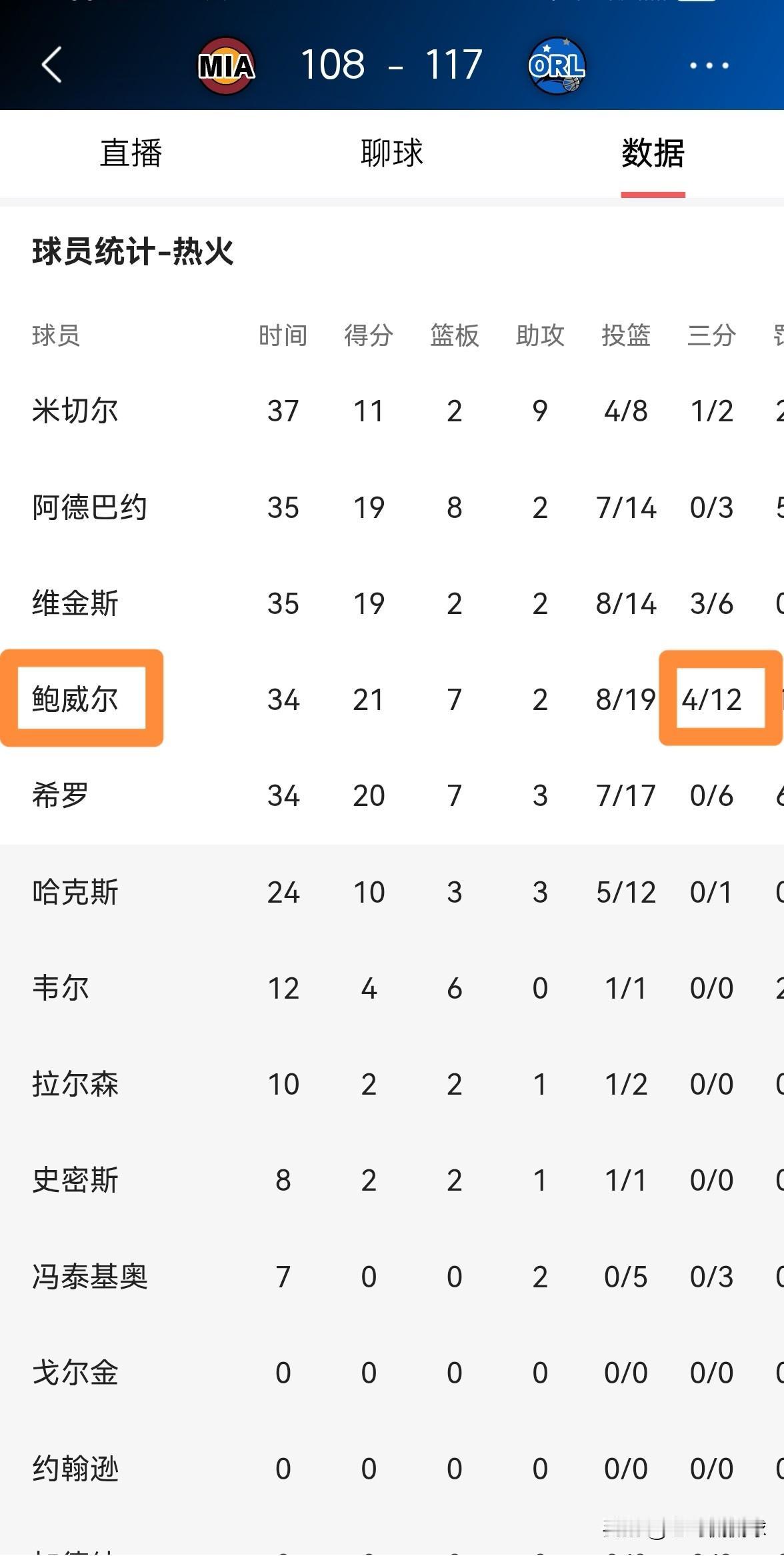 热火球星鲍威尔真是太敢投三分了!在今天热火客场以108:117不敌魔术的NBA杯1/4决赛中,鲍威尔在三分线外疯狂的出手12次,却只命中了4球,他的三分球命中率真是堪忧。 全场比赛下来,鲍威尔首发出战34分钟,投篮19中8,其中三分球12中4、罚球2中1得到21分,他的场上正负值为-4。 坦白说,如果本场比赛鲍威尔能够更多的冲击篮下,那么热火很有可能会赢下比赛,可惜的是鲍威尔投了太多的三分球。