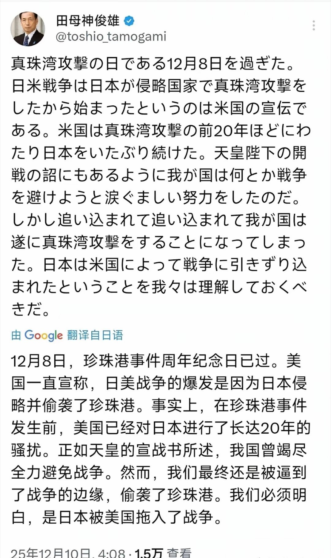 日本航空自卫队前参谋长叫嚣:“12月8日,珍珠港事件周年纪念日已过。美国一直宣称,日美战争的爆发是因为日本侵略并偷袭了珍珠港。事实上,在珍珠港事件发生前,美国已经对日本进行了长达20年的骚扰。正如天皇的宣战书所述,我国曾竭尽全力避免战争。然而,我们最终还是被逼到了战争的边缘,偷袭了珍珠港。我们必须明白,是日本被美国拖入了战争。”