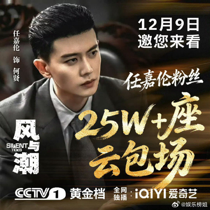 任嘉伦粉丝包场风与潮25w座 粉丝包场支持任嘉伦主演的新剧风与潮25w座,牛牛的!今晚20:00继续锁定央一、爱奇艺 ,看时代洪流中,孤勇者何贤如何破浪前行!