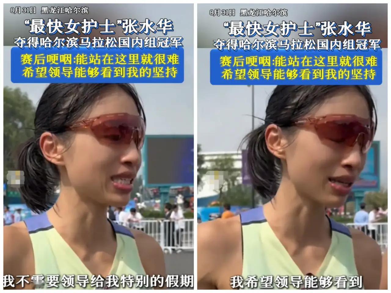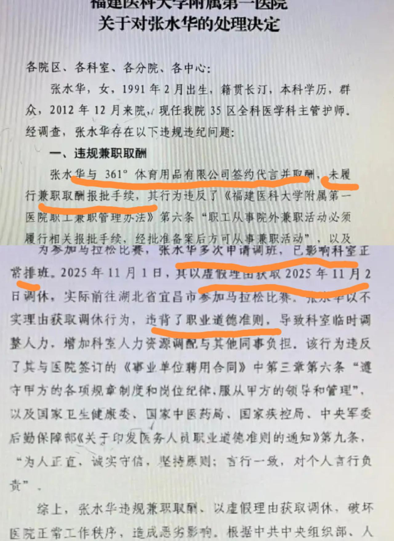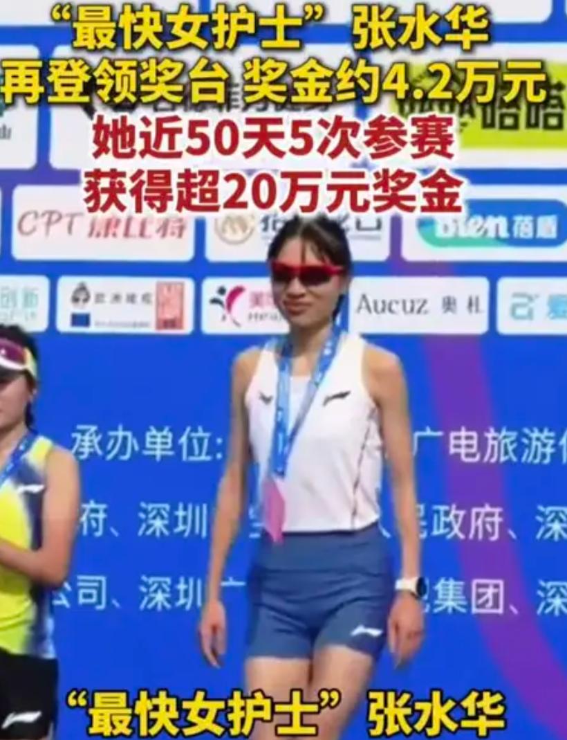 “最快女护士”张水华,要后悔死了! 前脚宣布不会直播带货,后脚就收到了 医院的警告处分。 50天跑5次马拉松拿了20万奖金,有点太招摇让人眼红,但凡有点情商的话,该请同事领导小聚一下作为感谢: 8月31日,张水华参加哈尔滨马拉松,获得女子国内第一名。 10月19日,张水华获得黄河口(东营)马拉松国内女子组第二名。 11月2日,张水华获得宜昌马拉松女子全马第一名。 11月23日,张水华参加中国马拉松精英排名赛,获得女子组第一名。 12月7日,张水华在深圳马拉松获国内女子组第三名。 作为护士坚持7年自己的业余爱好没问题,领导能安排一两次调班调休,时间久了论谁都很难理解和支持。 所以编造各种理由来调休,另外兼职签约某品牌代言,未报批,也违反了医院的规定。 对此,引发网友热议: 有网友说,每个人都有追求自己理想的权利,但我国医护人员缺口还是很大,医疗资源很不足,作为护士不应当频繁请假调休。 也有网友说,要坚持上班,否则过几年马拉松拿不到名次得不到奖金了,还得靠上班才稳定,在不影响本身工作的情况下,鱼与熊掌,可以兼得。 当前医院的一纸通报,把张水华浇了个透心凉,推翻了她此前说不会影响正常工作的言论,推测很大可能她会辞职,去全职参加马拉松,顺便直播带货! 女护士跑马拉松 护士跑马该不该支持