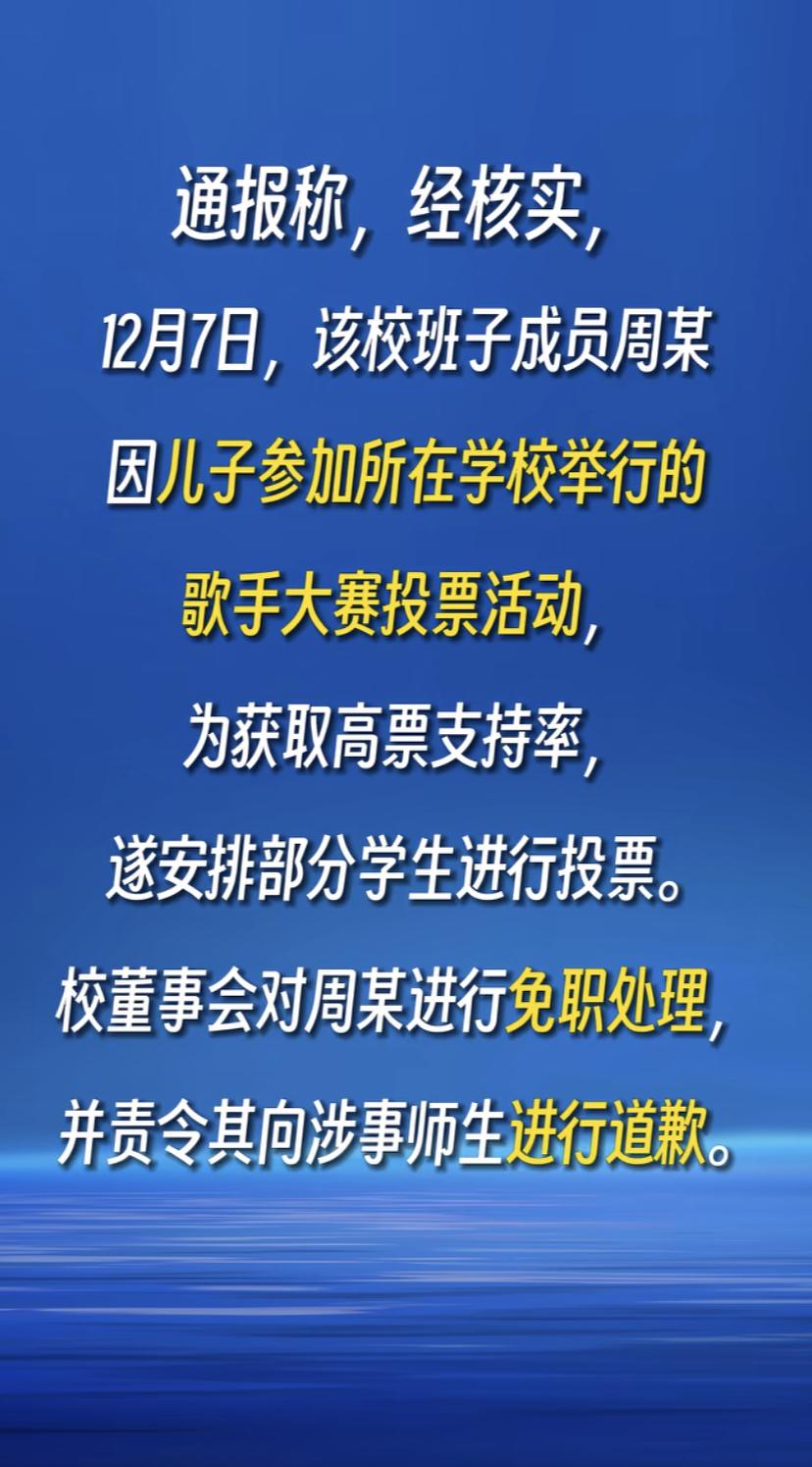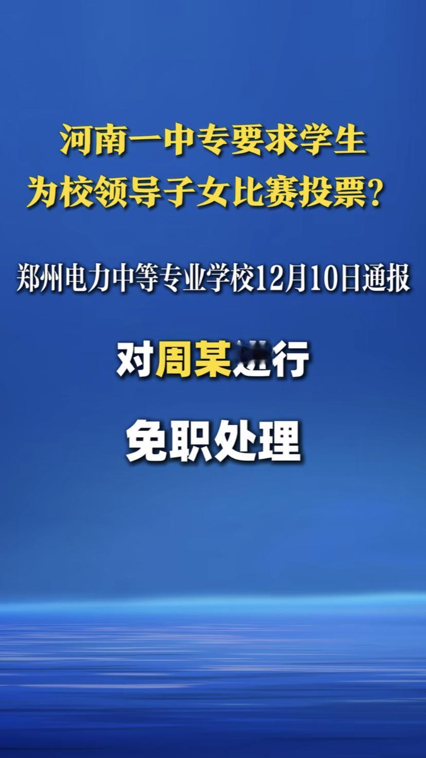 郑州一学校领导为给儿子投票,要求学校里面所有学生投票!目前已被免职处理! 有学生坚决抵制这种行为,并将相关消息发布在网上,引发了全网的关注。 其实这种投票活动见的挺多的,一般就是转发在群里面,请大家动动手指帮忙为某某某投票,但是强制投标确实是非常少见的。 各位是怎么看的?欢迎评论区留言。
