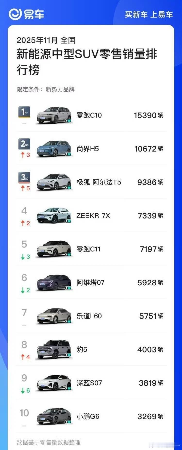 零跑C10成了新势力中型SUV里的“常胜将军”!已经连续7个月稳坐销冠宝座,1-11月累计销量也稳居第一,11月单月15390辆的成绩更是甩开竞品一大截,这实力真的没话说。能持续领跑,核心还是产品力够硬,800V纯电平台、605km续航加激光雷达,把续航和智驾的痛点都解决了。现在还有4000元尾款抵扣、整车终身质保等福利,性价比直接拉满。零跑用实打实的产品和诚意,让消费者看到了新势力造车的硬核实力,这样的车型火得一点都不意外!