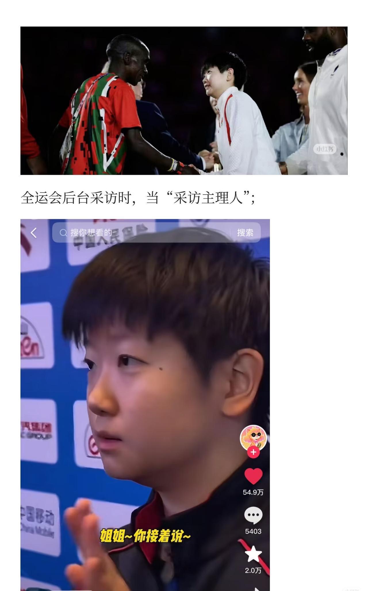 逢大事都要被莎莎的魅力圈粉,真的欲罢不能。 图1:釜山世乒赛,国乒连丢2分,重担落到莎莎肩上,后台她坐在球台上听邱指训话,坐着脚都够不到地的萌,没想到赛场上能把对手0封,绝对实力。 图2:巴黎合照,作为冠军自愿走下台阶拍照,这是促进国家外交的榜样。 图3:作为亚洲代表和乔爷爷握手;全运会后台采访,主动打断别人让正在采访的姐姐说完话。 她就是那么敞亮,就像网友说的:“不是她一定要干点啥事出来,是她的人格品行熠熠生辉。”!