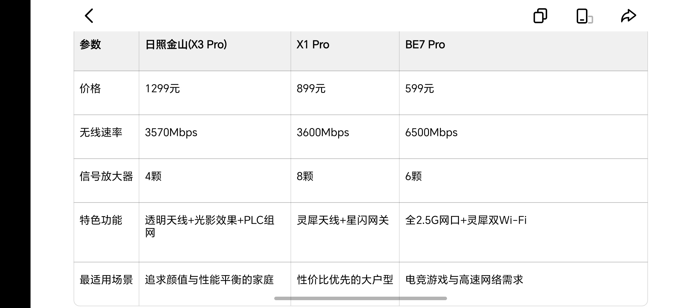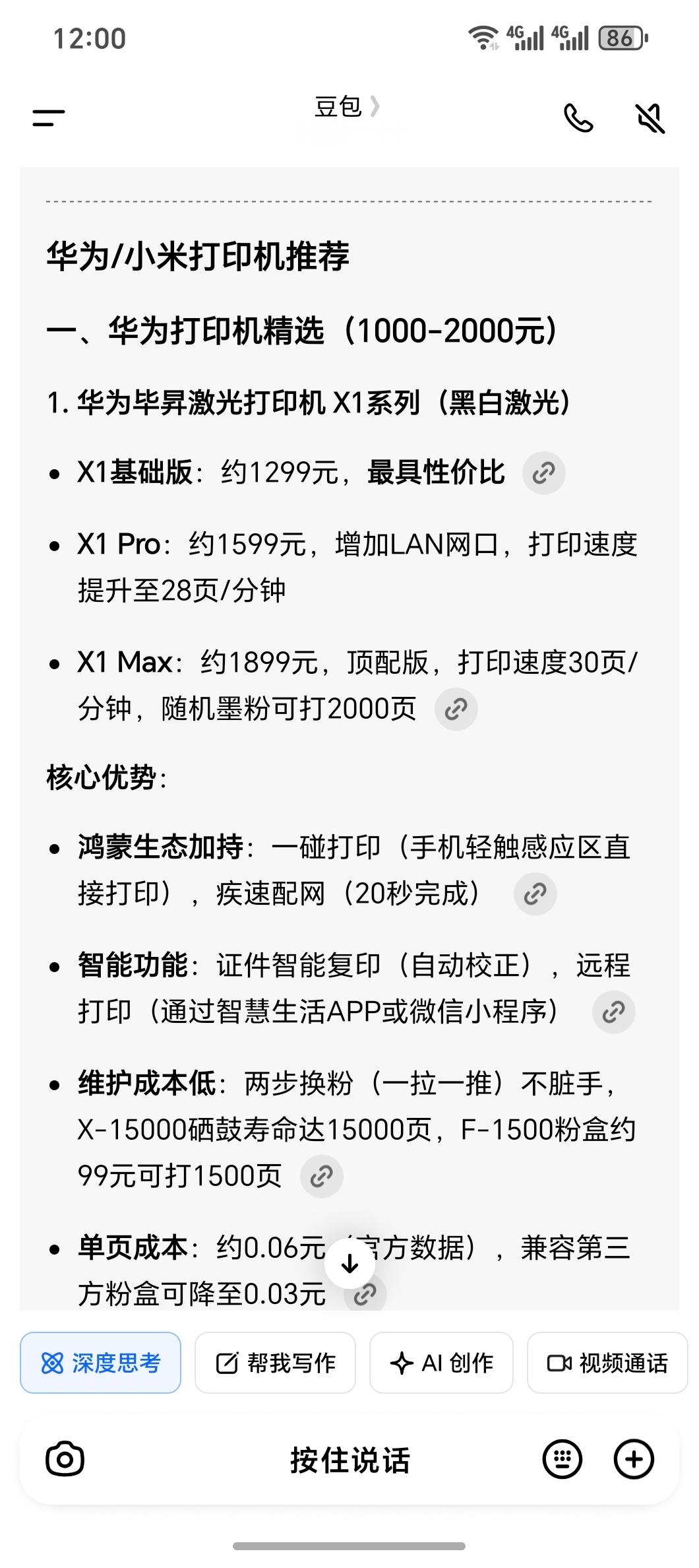 最近给办公室采购打印机和路由器我发现AI在搜集资料和对比参数上真的是很好用。比如说,我会问他华为的日照金山路由器对于办公室实不实用,同价位的话有什么性价比更高的选择。它就会结合我的需求,给出建议如果不是为了设计,X1 Pro和BE7 Pro更适合,性价比更高,讲道理以后各种评测意义真不大了,花10分钟看视频不如花10秒问AI