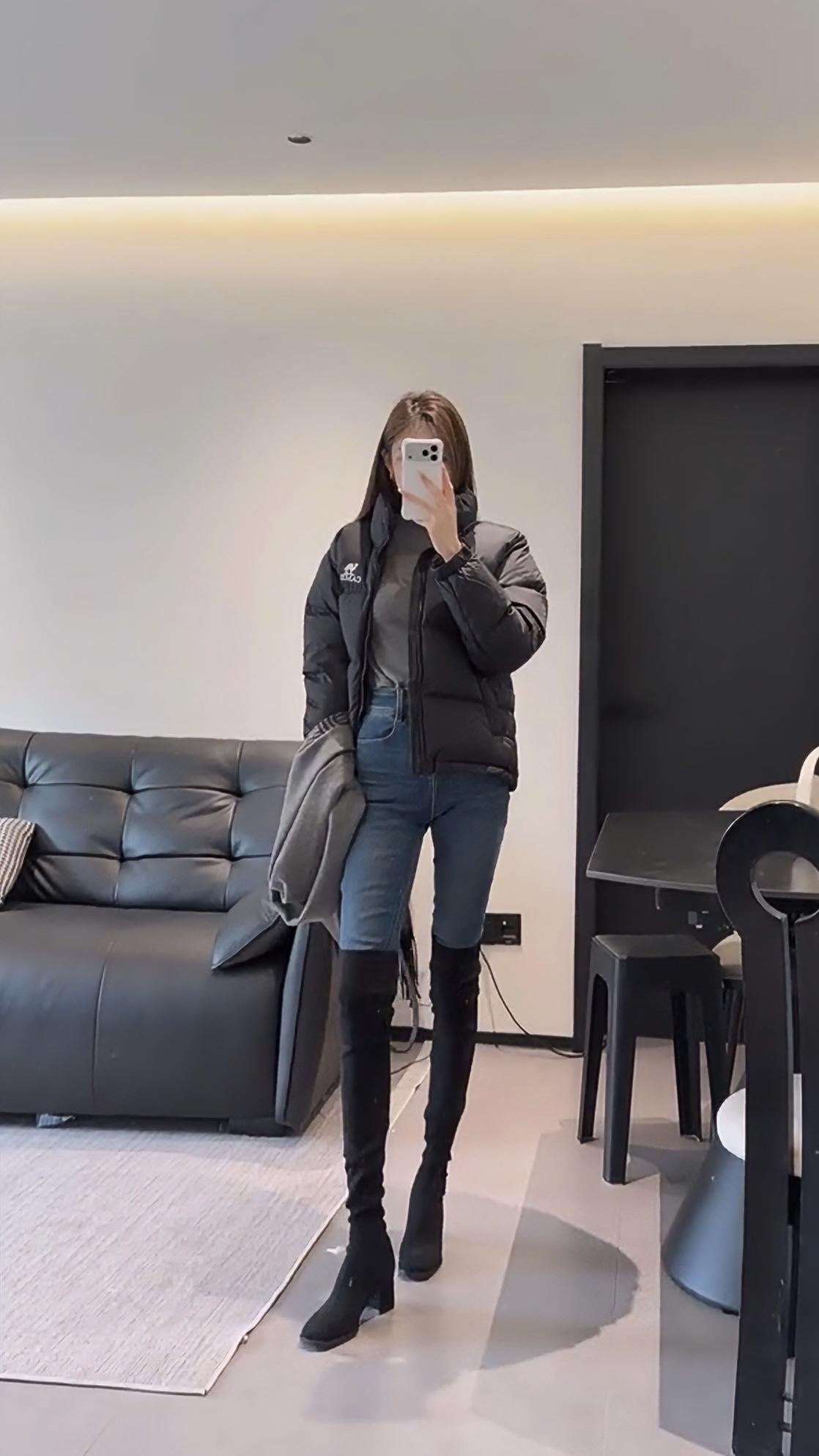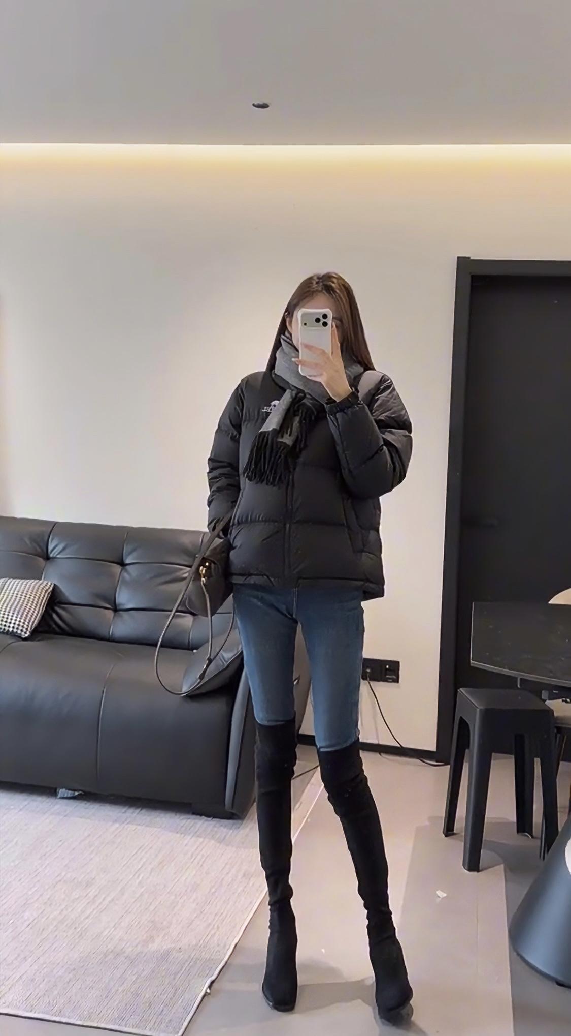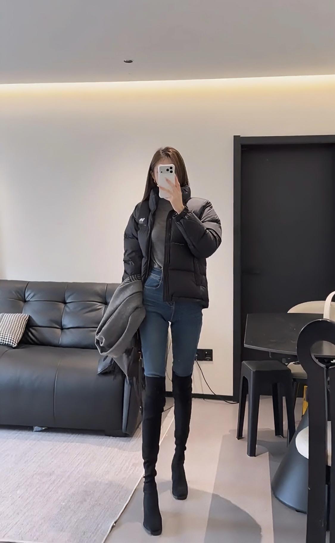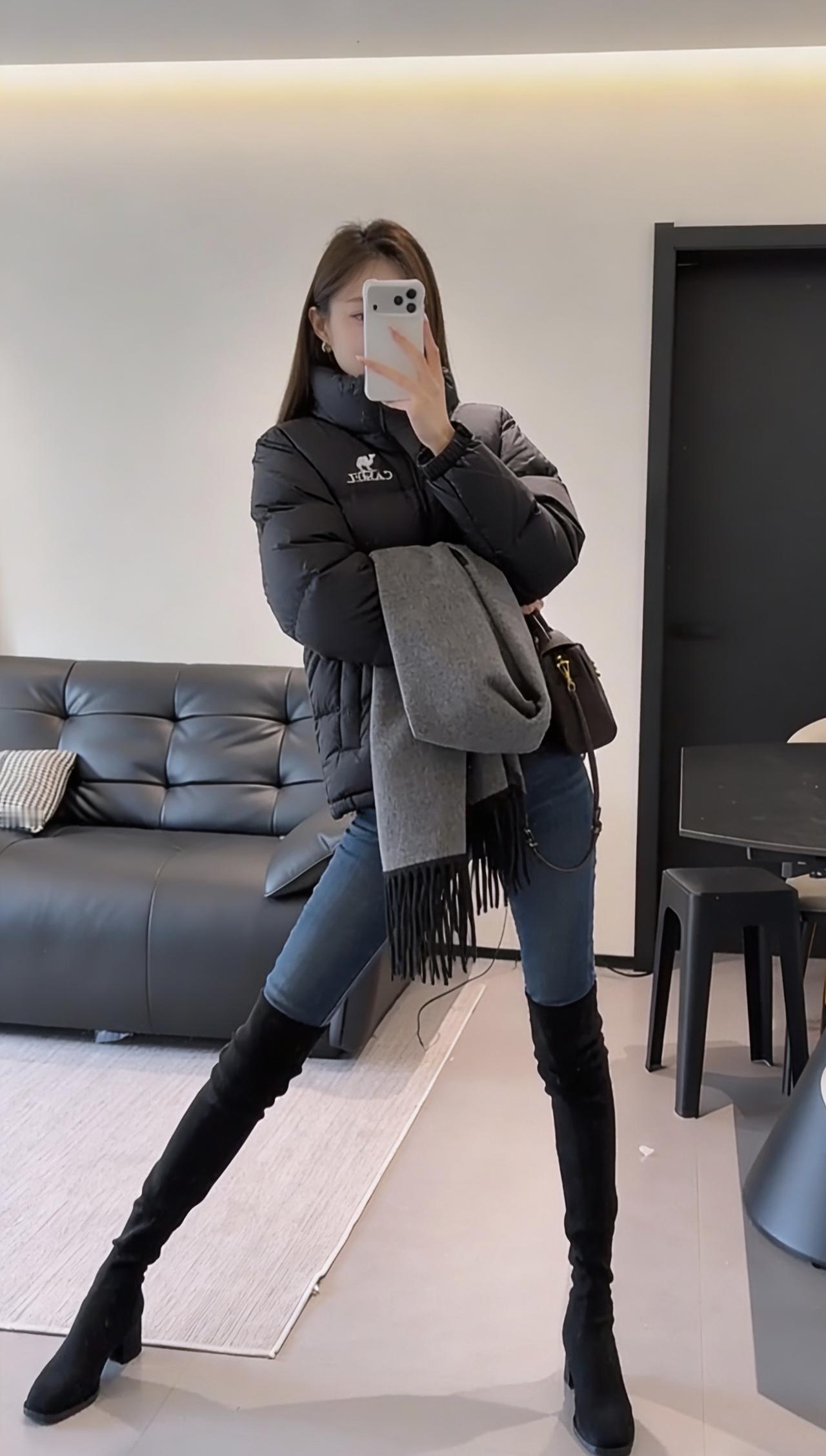 今日穿搭推荐是冬日休闲通勤风,整体简约又有质感: 上衣:黑色短款羽绒服+灰色内搭,保暖又轻便,短款版型能拉长身材比例; 下装:高腰牛仔裤+过膝长靴,既修饰腿型,又能在冬季兼顾保暖; 配饰:灰色流苏围巾+深色小挎包,增加了穿搭的层次感和精致感。 它的适配场合很广:日常通勤、休闲约会逛街、轻社交场合,风格松弛不张扬,保暖又不拖沓,舒适又不乏点睛之笔,轻松适配各种场合。