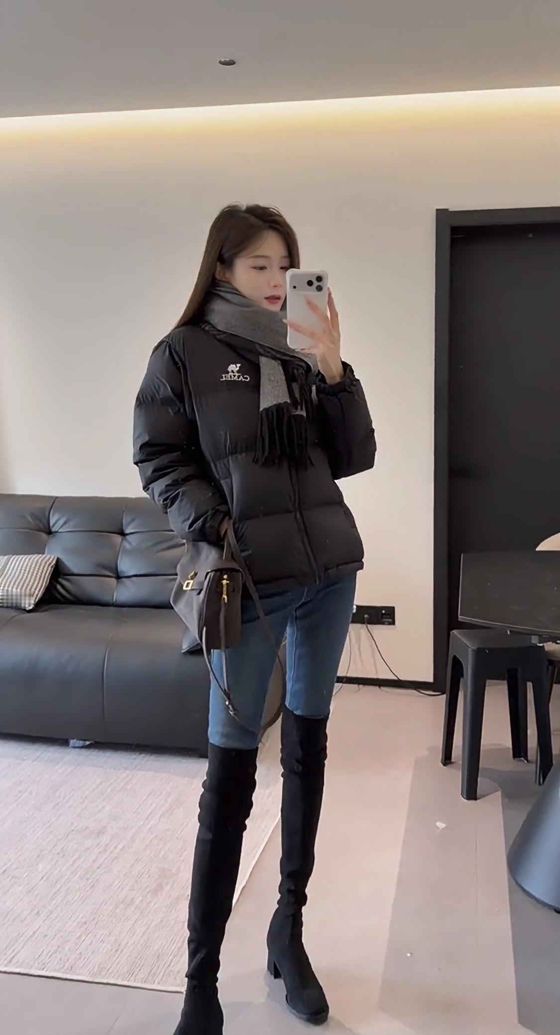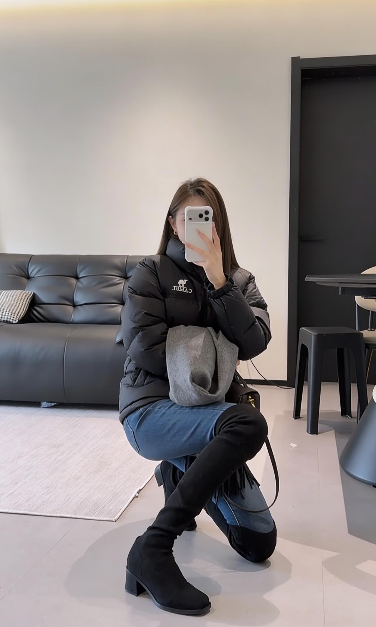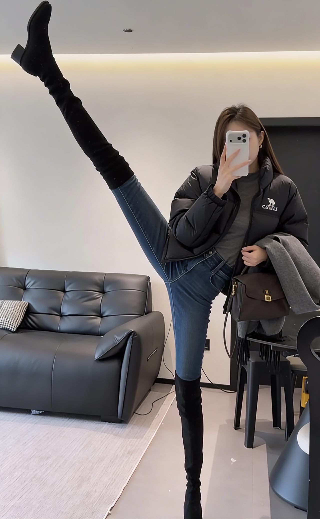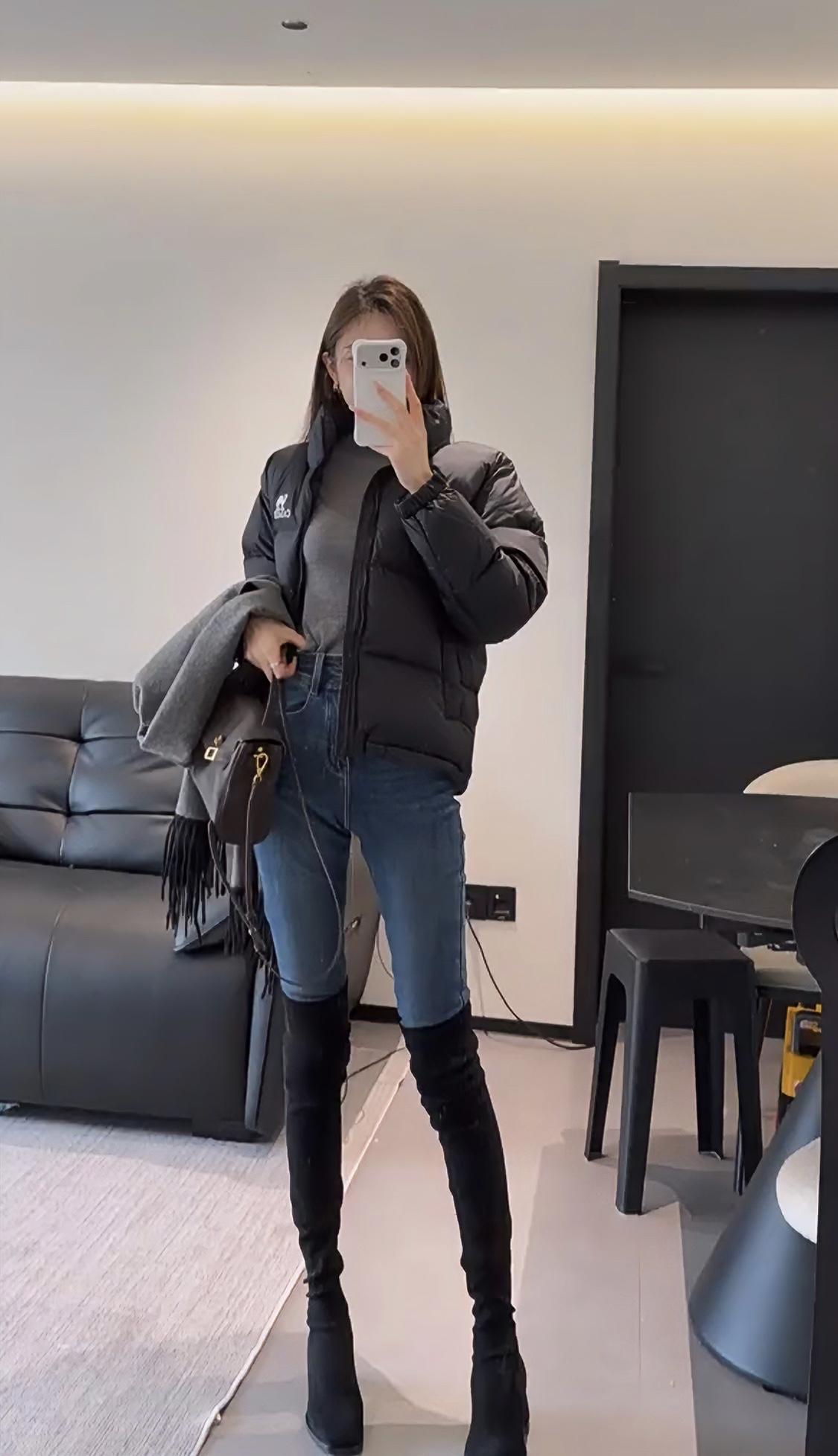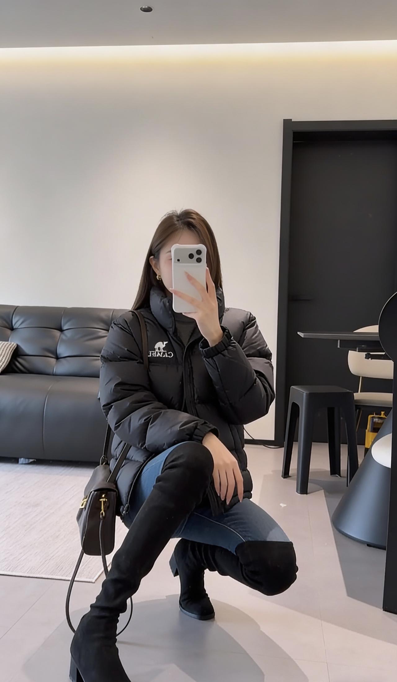 今日穿搭推荐是冬日休闲通勤风,整体简约又有质感: 上衣:黑色短款羽绒服+灰色内搭,保暖又轻便,短款版型能拉长身材比例; 下装:高腰牛仔裤+过膝长靴,既修饰腿型,又能在冬季兼顾保暖; 配饰:灰色流苏围巾+深色小挎包,增加了穿搭的层次感和精致感。 它的适配场合很广:日常通勤、休闲约会逛街、轻社交场合,风格松弛不张扬,保暖又不拖沓,舒适又不乏点睛之笔,轻松适配各种场合。