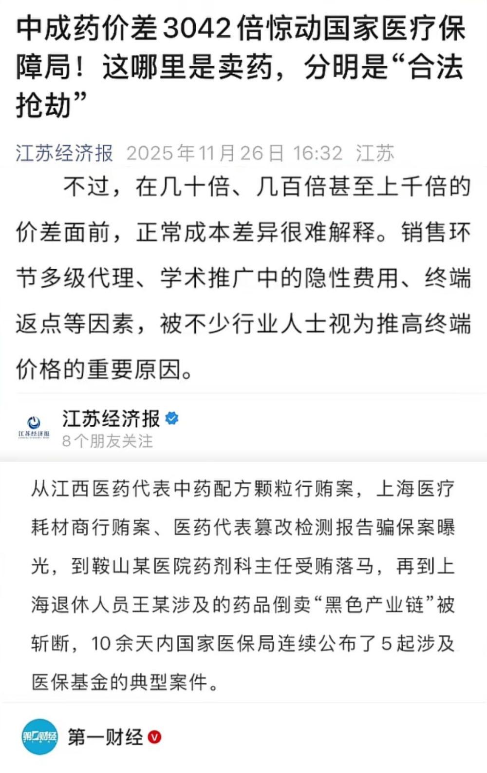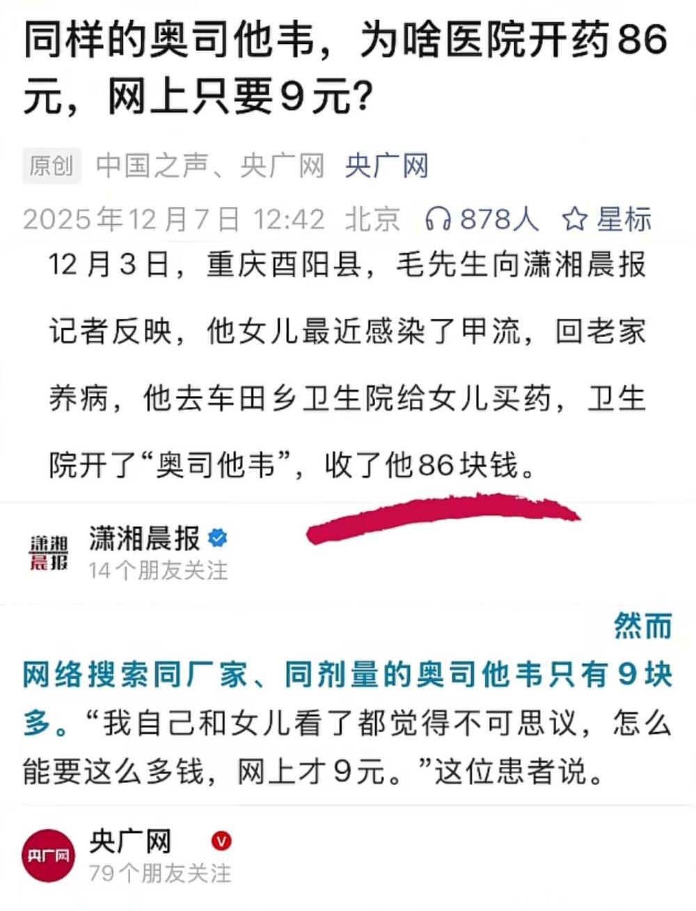 9块到86块的药价差异,撕开医药流通的“高开高返”遮羞布!一盒磷酸奥司他韦,网上药店9块钱能买到,基层卫生院却要86块,足足9倍的价差,任谁看了都得愣一愣。更让人费解的是,医院喊着零差率没挣钱,药店也说没亏钱,那凭空消失的77块,到底进了谁的口袋?这事根本不是简单的卖贵了,而是戳破了医药行业“高开高返”的灰色潜规则,撕开了基层医疗药品采购的遮羞布。 先说说医院的零差率为啥成了摆设。很多人以为零差率就是挤掉了药价里的利润水分,让患者拿到平价药,可实际情况是,医院的进货价本身就踩在了虚高的天花板上。基层卫生院号称服务老百姓,本该是药品采购的价格洼地,结果却成了高价药的接盘方,核心原因就是“高开高返”的行业游戏规则在作祟。 药厂先把药品挂网价定得极高,比如这盒奥司他韦,给医院的供货价标到86块,再通过虚假发票、咨询服务费、学术推广费等名目,把高额返点返还给采购链条上的各个环节,从药贩子到医院采购负责人,再到中间的开票公司,人人都能分一杯羹。 再看药店9块钱的零售价,其实才是药品的真实价值。药店能做到低价,是因为它绕开了医院采购的“官方挂网价”体系,直接对接了药厂的低价供货渠道。毕竟药店是市场化竞争,得靠低价吸引顾客,可医院采购走的是“官方平台”,看似流程正规,实则被“高开高返”的潜规则捆住了手脚。 更讽刺的是,那些竞争激烈、没什么名气的药,反而会把挂网价抬得更离谱,因为只有留出足够高的价格空间,才能支撑起层层返点,吸引小医院和药店去推。之前爆出的3042倍价差的中成药,就是这种畸形规则的极端体现,患者买的不是药,是整条灰色产业链的“服务费”。 这种事的本质,是基层医疗采购体系的漏洞被潜规则钻了空子。医院的“零差率”政策初衷是好的,想切断医院和药品销售的利益关联,可没成想,利益链从“医院加价”转移到了“采购环节的返点”。 基层医疗机构本该是守护老百姓用药的最后一道防线,结果却成了医药腐败的“重灾区”,核心问题就出在采购环节的透明度不足。医院放着低价药不采,非要选高价药,不是采购人员不懂比价,而是高价药背后的返点利益在驱动。 这种操作不仅掏空了患者的看病钱、救命钱,还让基层医疗的公信力打了折扣。老百姓本来信任公立医院的定价,结果却发现自己成了灰色产业链的“冤大头”。 好在国家已经开始重拳整治,半个月曝光5起药品行贿案、治理不合理挂网价,这些动作都是在往医药流通的“最后一公里”动刀子! 但要真正抹平9块和86块的药价鸿沟,光靠曝光个案不够,还得从根上解决问题,一方面要打破“官方挂网价”的信息壁垒,让采购价和市场价对标,杜绝虚高定价。 另一方面要把采购环节晒在阳光下,让每一笔药品采购的价格、渠道都可查可追溯,斩断返点利益链。只有让基层医院的进货价回归真实,让“零差率”真正惠及患者,老百姓才能不再为天价平价药的差价买单,看病贵的痛点才能真正缓解。 毕竟,药品是用来治病救人的,不是用来给产业链分赃的。9块和86块的价差,差的不只是钱,更是医疗行业该有的良心和底线! 药价差距 奥司他韦对比 药价内幕