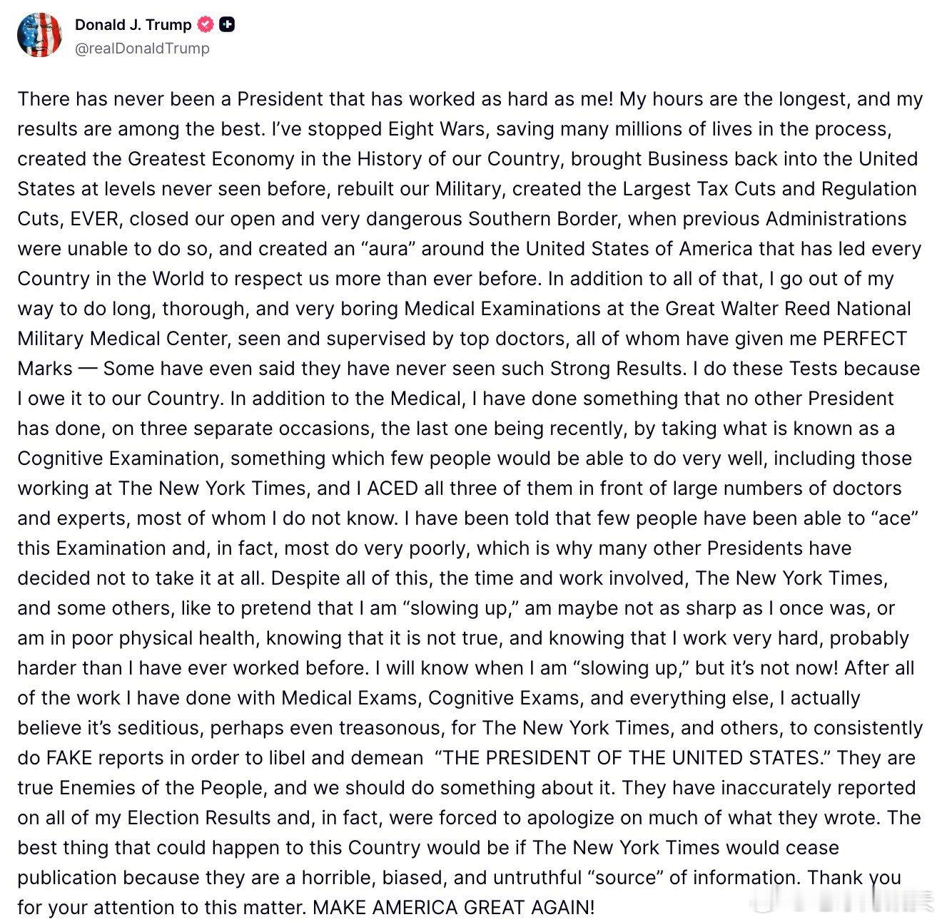 ‼️特朗普发长文批判“假新闻”纽约时报,并呼吁其停止出版:“从来没有一位总统像我这样努力工作过!我的工作时间是最长的,我的成果也是最好的。我结束了八场战争,在这个过程中拯救了数百万人的生命,创造了我们国家历史上最伟大的经济,将商业带回美国,达到了前所未有的水平,重建了我们的军队,创造了有史以来最大的减税和监管削减,关闭了我们开放且非常危险的南部边境,而之前的政府无法做到这一点,并在美国周围创造了一种“光环”,这让世界上每个国家都比以往任何时候都更尊重我们。除了所有这些之外,我还特意去做了漫长、彻底且非常枯燥的体检,在伟大的沃尔特·里德国家军事医疗中心,由顶尖医生监督,他们都给了我完美的分数——有些人甚至说他们从未见过如此强劲的结果。我做这些测试是因为我对我们的国家负有责任。除了体检之外,我还做了其他总统没有做过的事情,在三个不同的场合,最后一次是最近,通过参加所谓的认知考试,这种考试很少有人能做得很好,包括那些在《纽约时报》工作的人,我在大量医生和专家面前完美通过了所有三次考试,其中大多数人我不认识。我被告知,很少有人能“完美通过”这项考试,事实上,大多数人表现得很差,这就是为什么许多其他总统决定根本不参加的原因。尽管如此,考虑到所涉及的时间和工作,《纽约时报》和其他一些人喜欢假装我“在放缓”,也许不像以前那么敏锐了,或者身体健康状况不佳,他们知道这不是真的,知道我工作非常努力,可能比以往任何时候都更努力。我会知道自己什么时候“在放缓”,但现在不是!在我完成了所有体检、认知考试和其他一切之后,我其实相信《纽约时报》和其他人不断发布假新闻是为了诽谤和贬低“美国总统”,这是煽动性的,或许甚至是叛国的。他们是人民的真正敌人,我们应该对此采取行动。他们不准确地报道了我所有的选举结果,事实上,被迫就他们写的大部分内容道歉。对这个国家来说,最好的事情就是《纽约时报》停止出版,因为他们是一个可怕的、偏见的和不真实的“信息来源”。感谢您关注此事。让美国再次伟大!”热点现场海外编译精选海外新鲜事