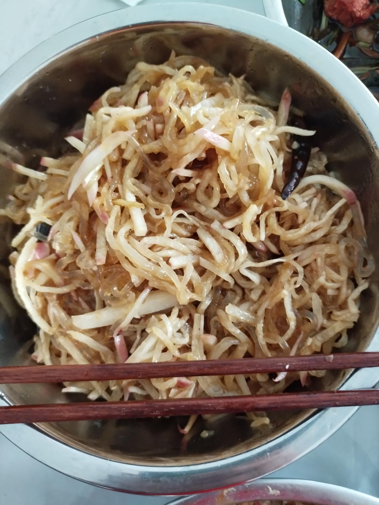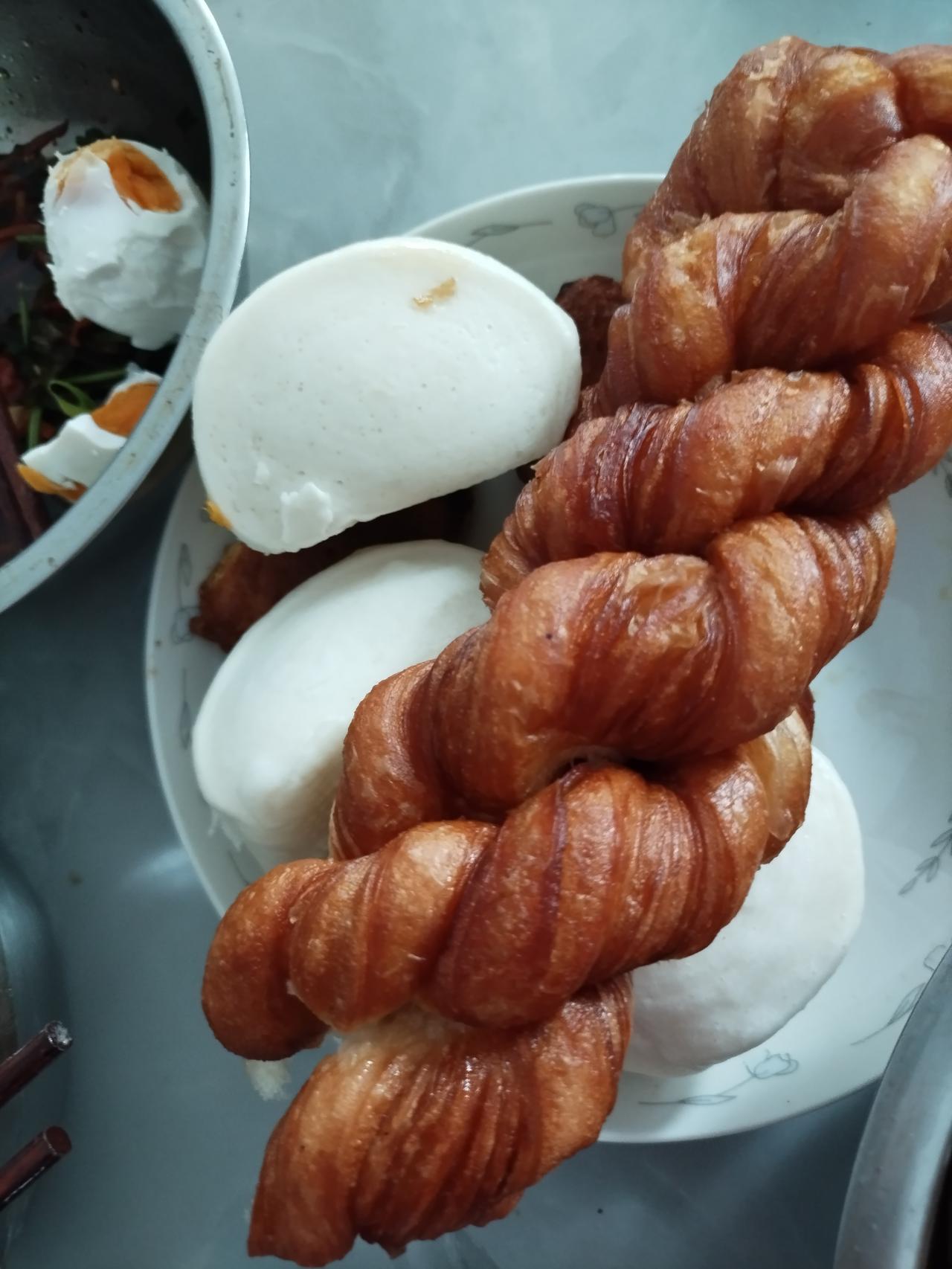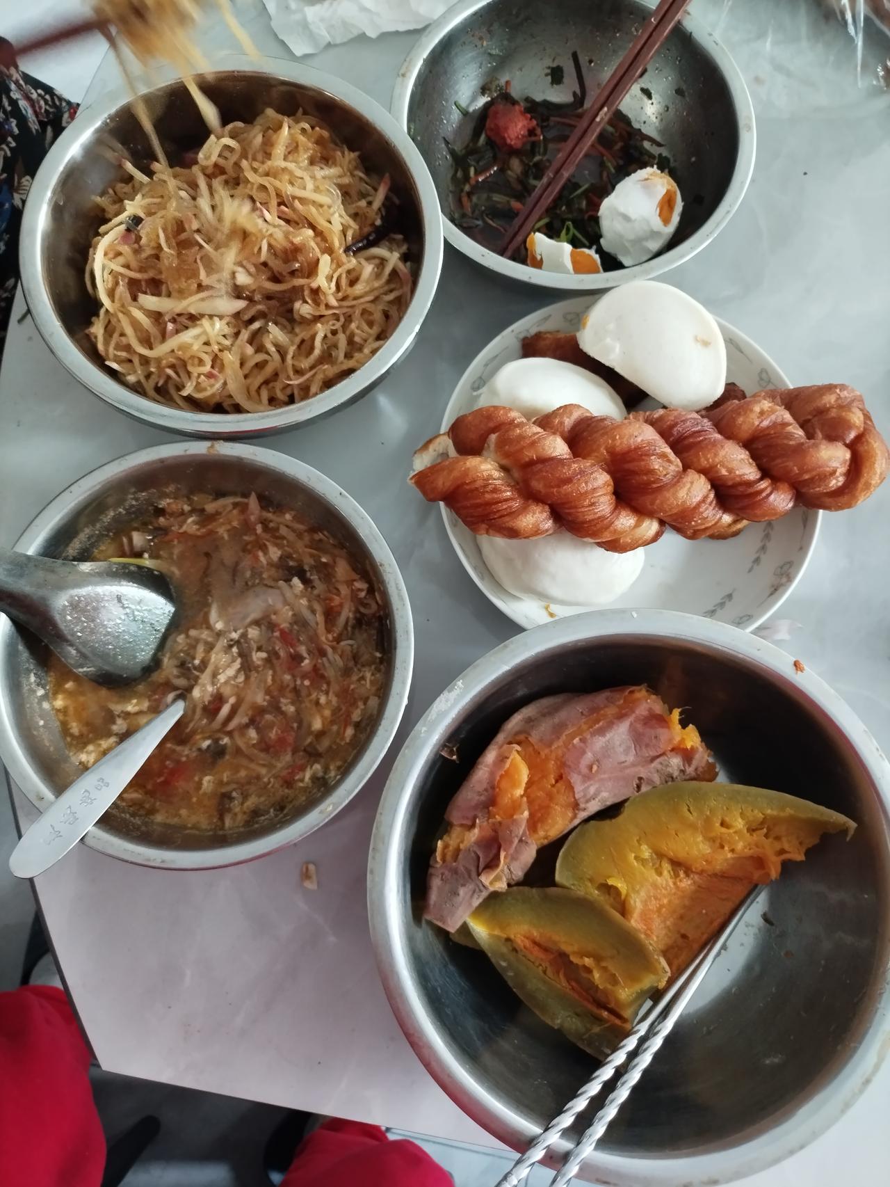 老两口的幸福生活。 老伴儿上午搁超市儿买了10元钱4根儿大麻花儿。 中午萝卜丝儿,炒粉条。 早晨洋柿子蛋花儿汤有点儿咸,没吃了。 馒头麻花昨天烀的地瓜和南瓜,大蒸锅一溜。 我们俩吃的很可口。 朋友们,我俩的中午饭怎么样?