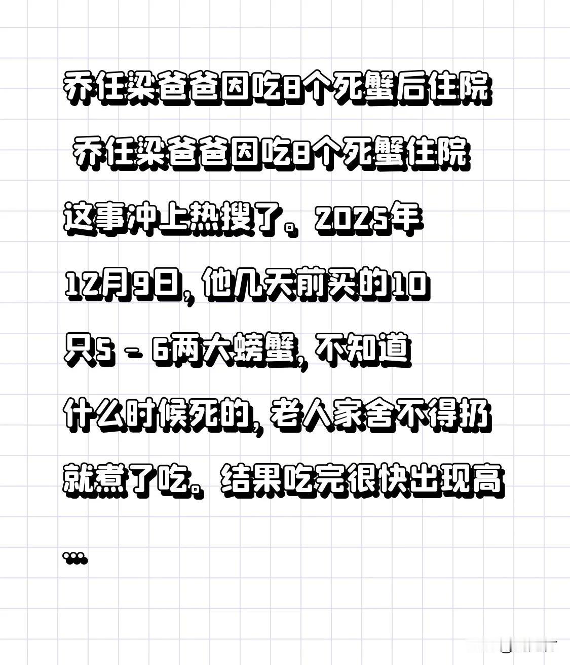 乔任梁爸爸因吃8个死蟹后住院 乔任梁爸爸吃8个死蟹后住院一事冲上热搜。2025年12月9日,他此前买的10只重5 - 6两的大螃蟹不知何时死了,老人家舍不得扔,便煮来吃了。吃完不久,他就出现高烧、呕吐症状,身体迅速衰竭,被确诊为酮症酸中毒。 专家早有提醒,螃蟹死后体内细菌会快速繁殖并产生毒素,如副溶血性弧菌和沙门氏菌,常温下2小时菌落总数就能增长22% ,高温也难以完全消除。这给大家提了个醒,别像乔爸爸一样因小失大,为避免浪费把自己吃进医院,生命健康才是最重要的! 吃死螃蟹 馒头蟹标本