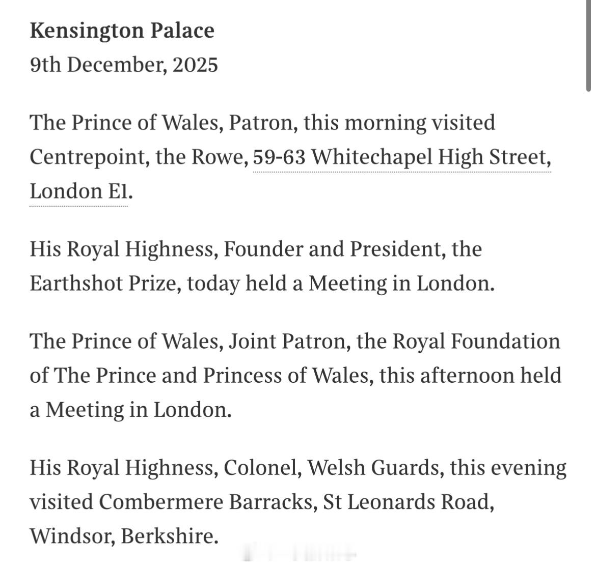 威廉王子 【公务日志】2025年12月9日,威廉王储在伦敦访问慈善机构Centre point之后,随后在伦敦分别召开The Earthshot Prize会议和威尔士亲王夫妇皇家基金会会议(总共2️⃣会议),晚上在温莎康伯米尔兵营访问威尔士团。