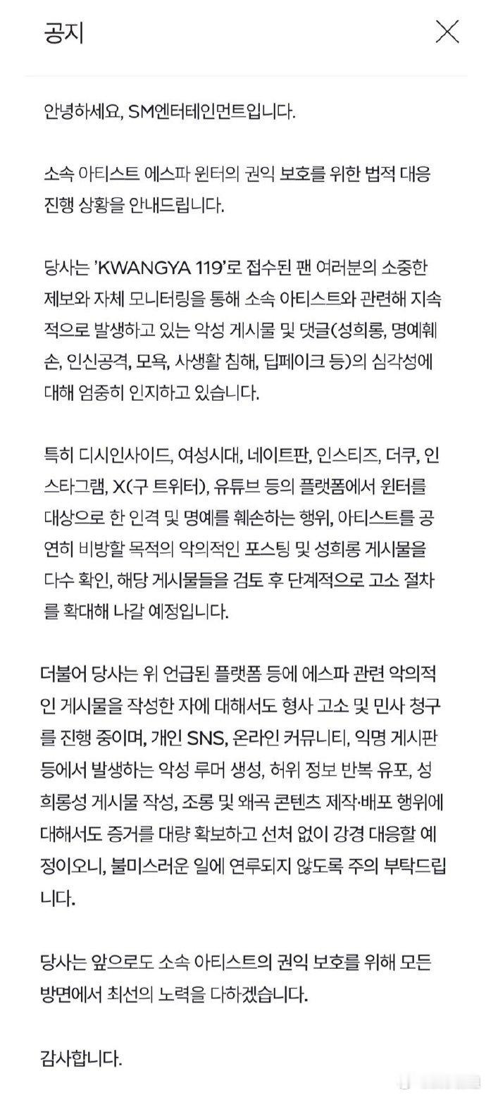 WINTER告黑声明SM发布金玟庭告黑公告,支持维权