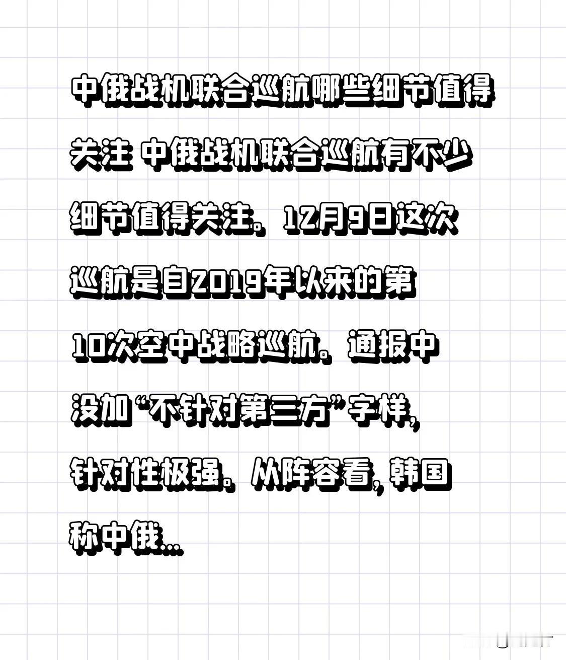 中俄战机联合巡航哪些细节值得关注 中俄战机联合巡航有不少细节值得关注。12月9日这次巡航是自2019年以来的第10次空中战略巡航。通报中没加“不针对第三方”字样,针对性极强。 从阵容看,韩国称中俄出动9架战机进入其东部和南部防空识别区,俄方7架,中方2架。以往俄至少出动1架图 - 95MS战略轰炸机,配米格 - 31或苏 - 35护航;中方不排除轰 - 6K及随行战斗机。 近期王毅外长访俄,与俄方就日本问题战略对表,强调抵制日本军国主义。如今联合巡航结合此前反导演习,都是针对当下局势的行动,展现了中俄维护二战胜利成果的决心。
