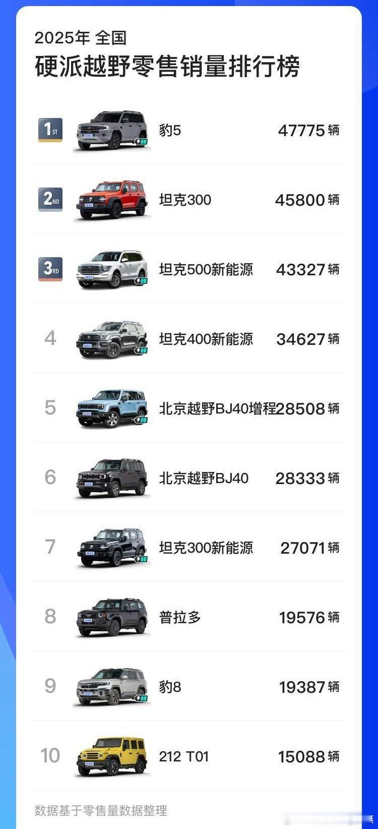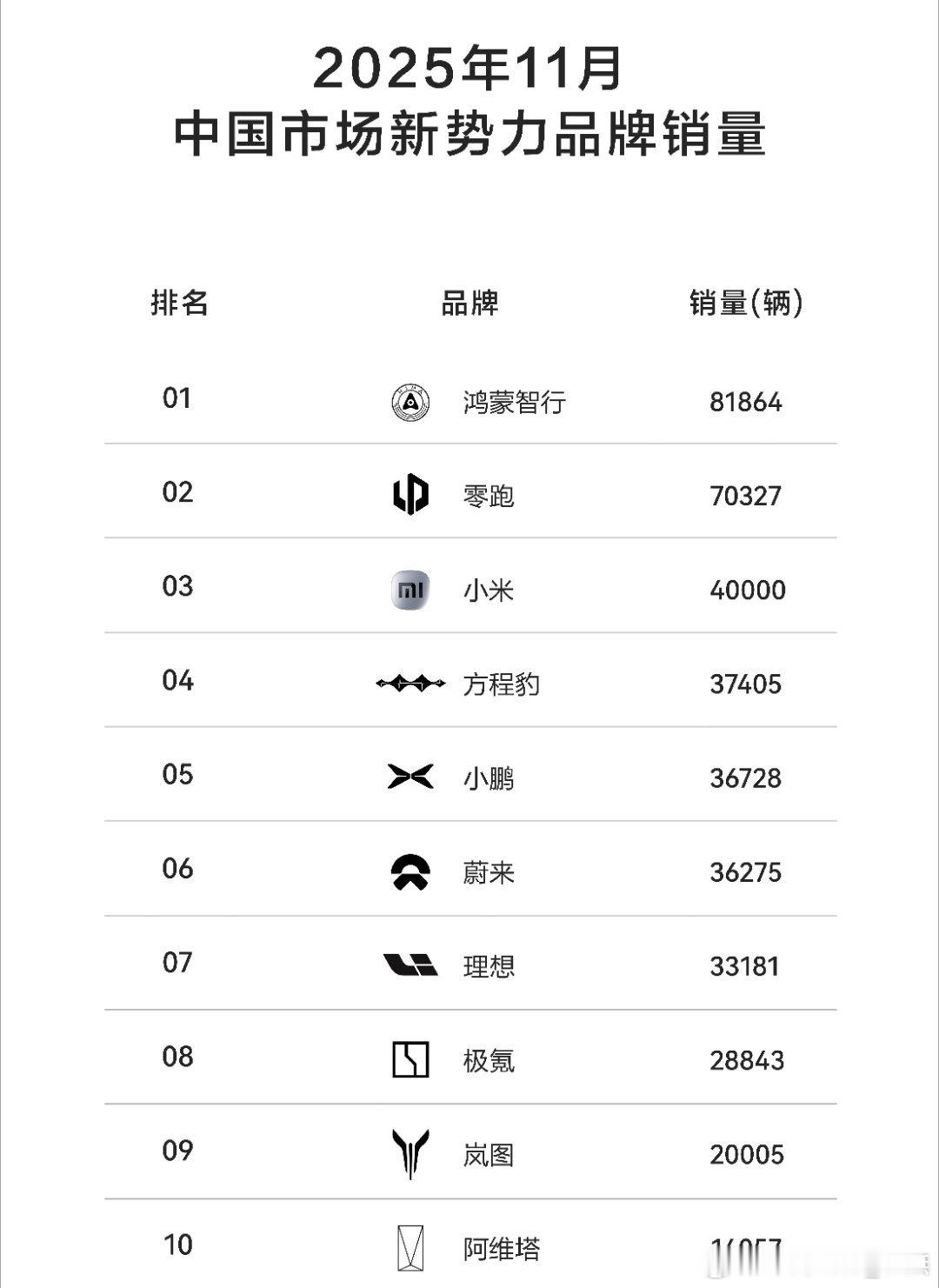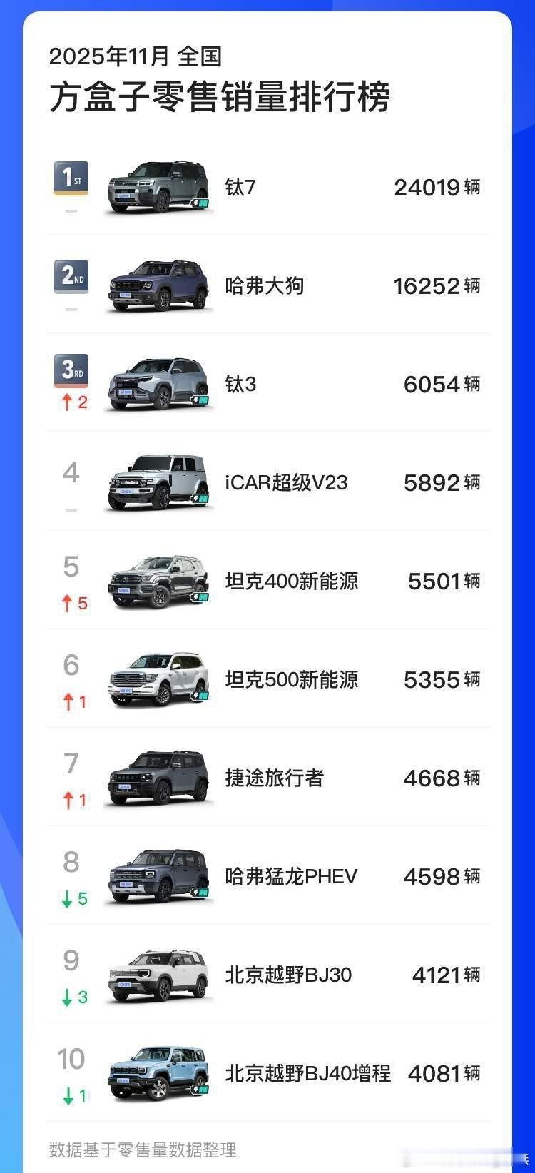 方程豹汽车11月猛销37405台,同比暴涨339%,超过蔚小理跃居新势力品牌销量TOP4,品牌势能全面爆发。现象级爆款车型 钛7:以24019台的单月销量,再次霸榜混动SUV销量冠军、方盒子车型销量冠军。“科技潮品SUV”钛3,11月销售6054台,拿下纯电方盒子销量冠军、跻身方盒子车型销量TOP3。“越野新王”豹5,11月销售5569台,登顶11月新能源硬派越野批发销量冠军、2025年1-11月硬派越野累计销量冠军。“稀缺旗舰”豹8,11月销售1763台,持续领跑40万级高端SUV市场。