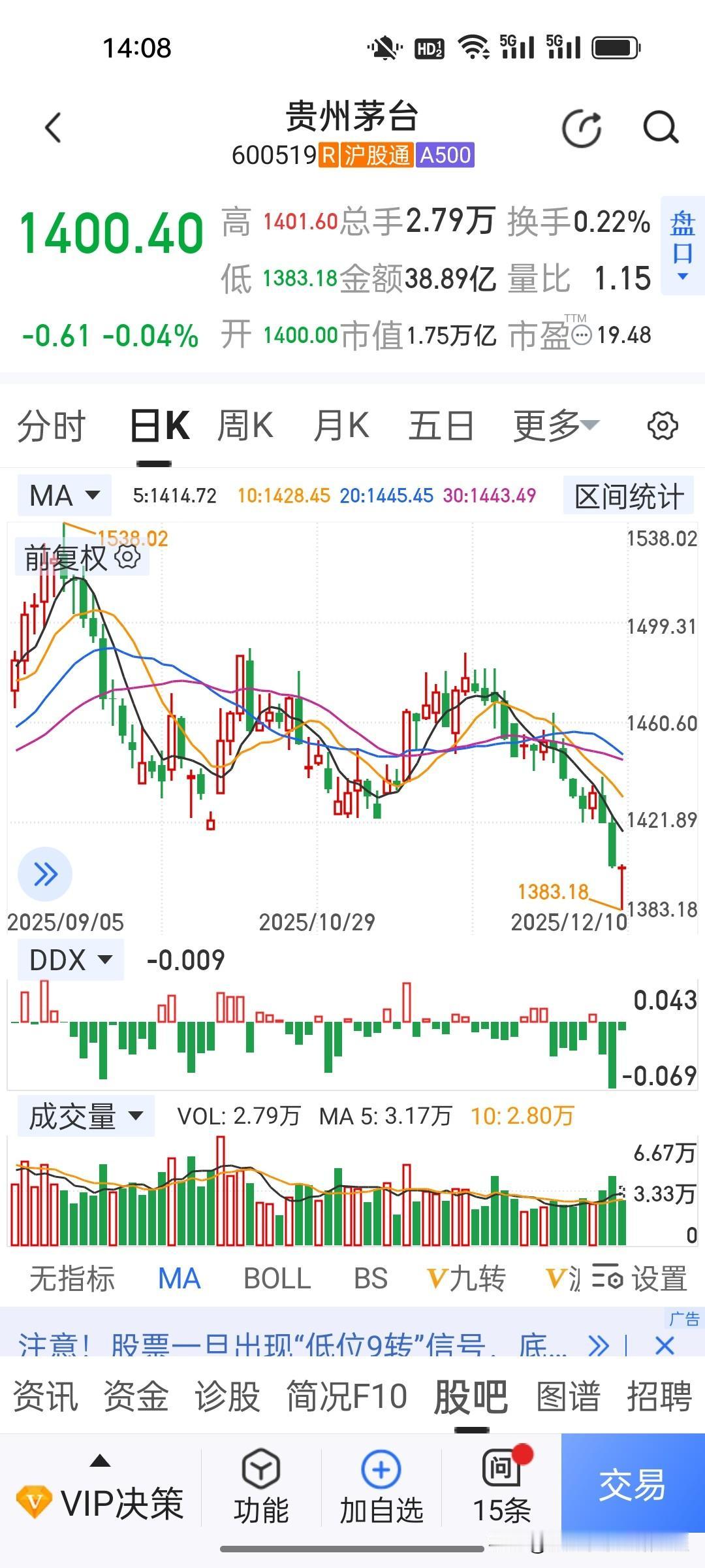 段永平是自带点“茅台运”的。为什么这么说?10月13日,段永平发文说“买了点茅台”,段永平那天是在茅台跳空创下新低的情况下买的,接着茅台连续反弹了四天,涨幅超过4%,接着又横盘震荡,一度创下五个月新低,段永平新买的茅台肯定没赚到钱,段永平还是依然坚守茅台,同时建议大家有闲钱买茅台股票比存银行要好。 昨天,段永平接受王石夫妇采访视频播出后,今天茅台竟然探底回升了,看来主力也要给为数不多的依然看好茅台的人一点正回应啊!