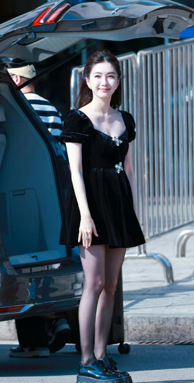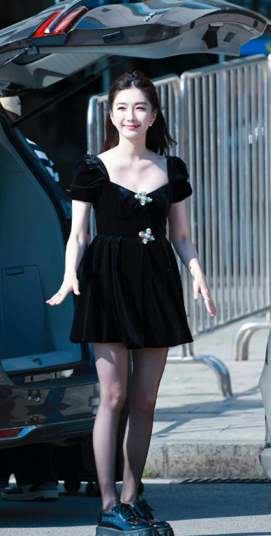 江疏影黑色短裙穿搭 ,我感觉比戴眼镜的造型好多了