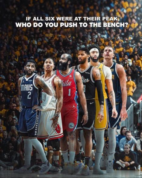 所有人都正值巅峰 谁会被挤到替补席上?控卫:凯瑞.欧文控卫:德里克.罗斯分卫:詹姆斯.哈登小前:保罗.乔治大前:安东尼.戴维斯中锋:尼古拉.约基奇哈登防守是个漏洞,应该让罗斯顶上分卫的位置!浓眉又比较脆,也可以去掉浓眉打一大四小!你怎样认为?欢迎来评论区讨论!NBAnba吐槽大会