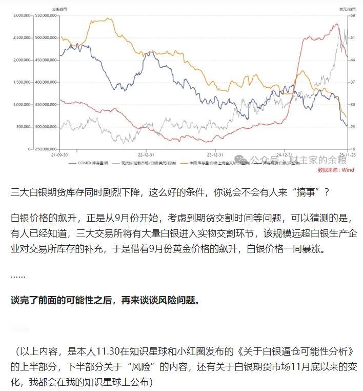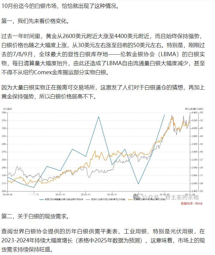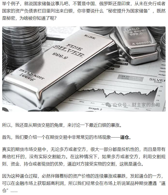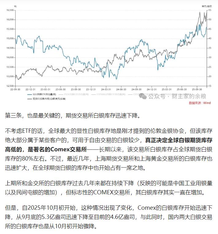 白银 “史诗级上涨” 真不是国家囤银、香港金库炒作!作为早年牵头抄底实物白银(如今涨超 3 倍)的资深博主,我戳破市场传闻:央行从未将白银列入储备,K 线 “杯柄” 更是牵强附会。 真相藏在期货逼空逻辑里 —— 黄金强势带动银价从 30 美元涨至 50 美元,光伏用银激增 + 印度疯狂抢购 + ETF 持续增持,现货需求彻底爆发。 更关键的是,Comex、上期所等三大交易所库存 10 月后集体骤降,可交易白银持续短缺。当 “价格上涨 + 需求旺盛 + 库存暴跌” 三大条件齐聚,多方借交割规则逼空的行情正式启动。 这波上涨到底是趋势还是泡沫?风险正在悄悄酝酿! 原文来自:路财主《白银,必然的史诗级暴涨?》
