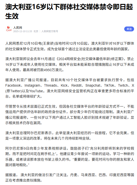 澳大利亚禁止16岁以下少年使用社交媒体规定正式生效。周三,澳大利亚各地的孩子们醒来后发现自己无法访问社交媒体账户。这是世界首例此类禁令。但澳大利亚这样“一刀切”究竟利大还是弊大,需要一定的时间进行验证。澳大利亚表示,这样做旨在保护 16 岁以下的少年儿童免受令人上瘾的算法、网络猎手和网络霸凌的侵害。有报道称,已有多国考虑采取类似做法。老胡个人觉得,如今技术手段这么多,应当先对青少年实施算法和接触门槛的多重保护,现在这方面的研究太弱了。如果保护工具足够多,就能既让少年使用社交媒体,又能有效减少对他们的侵害。
