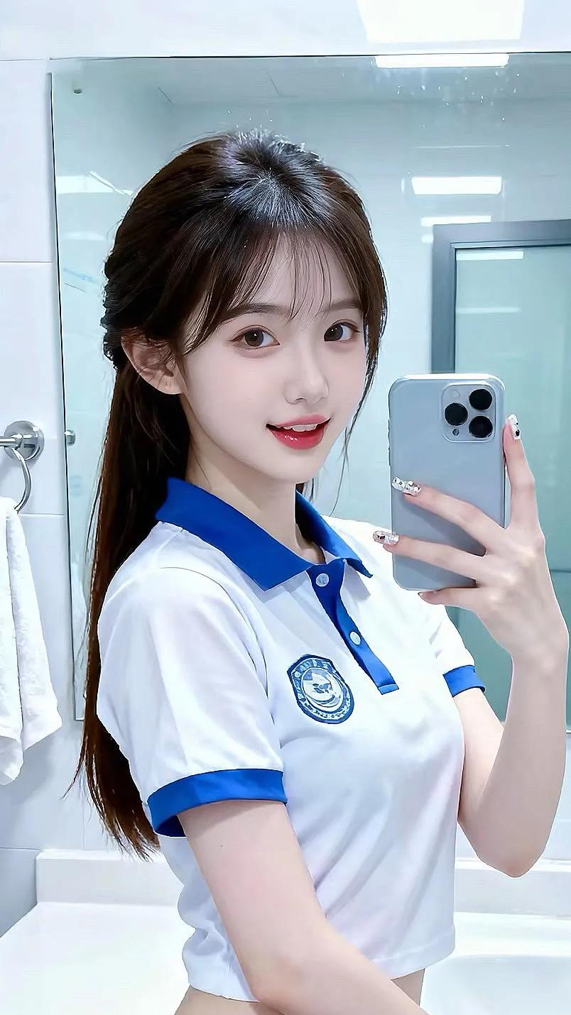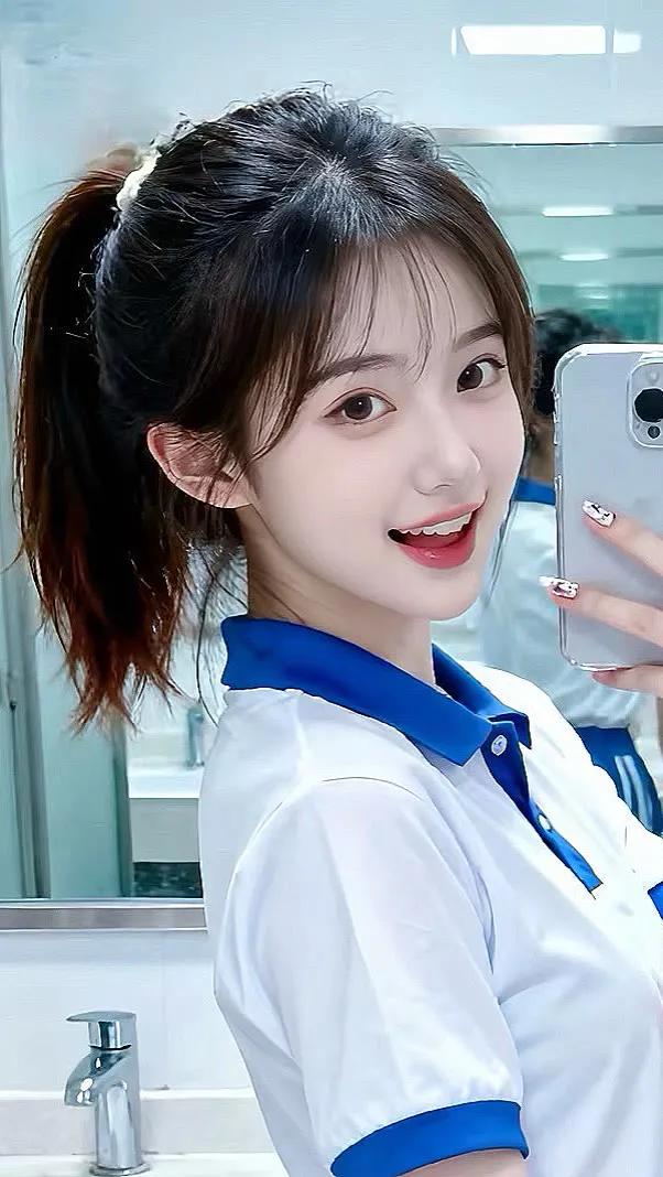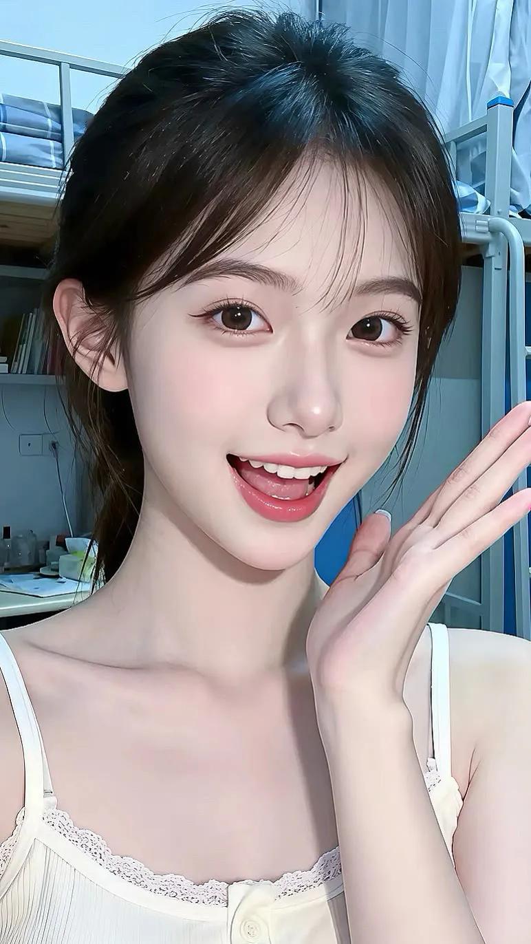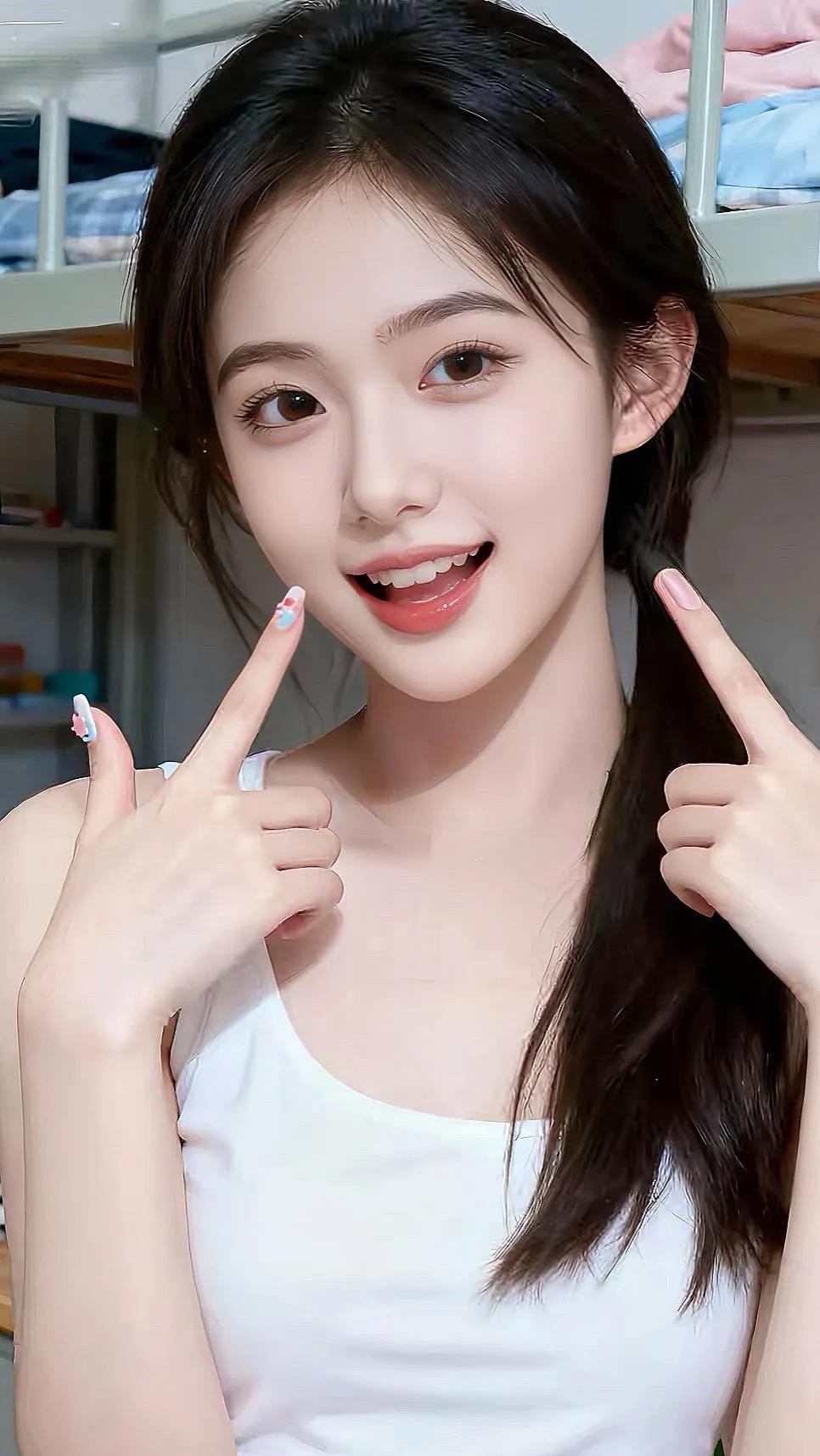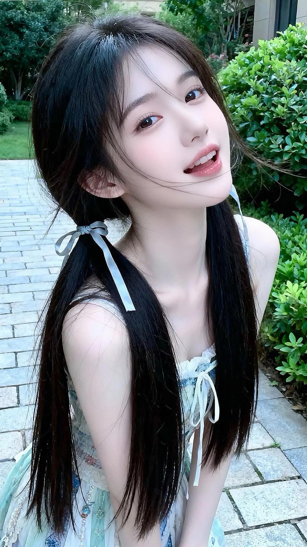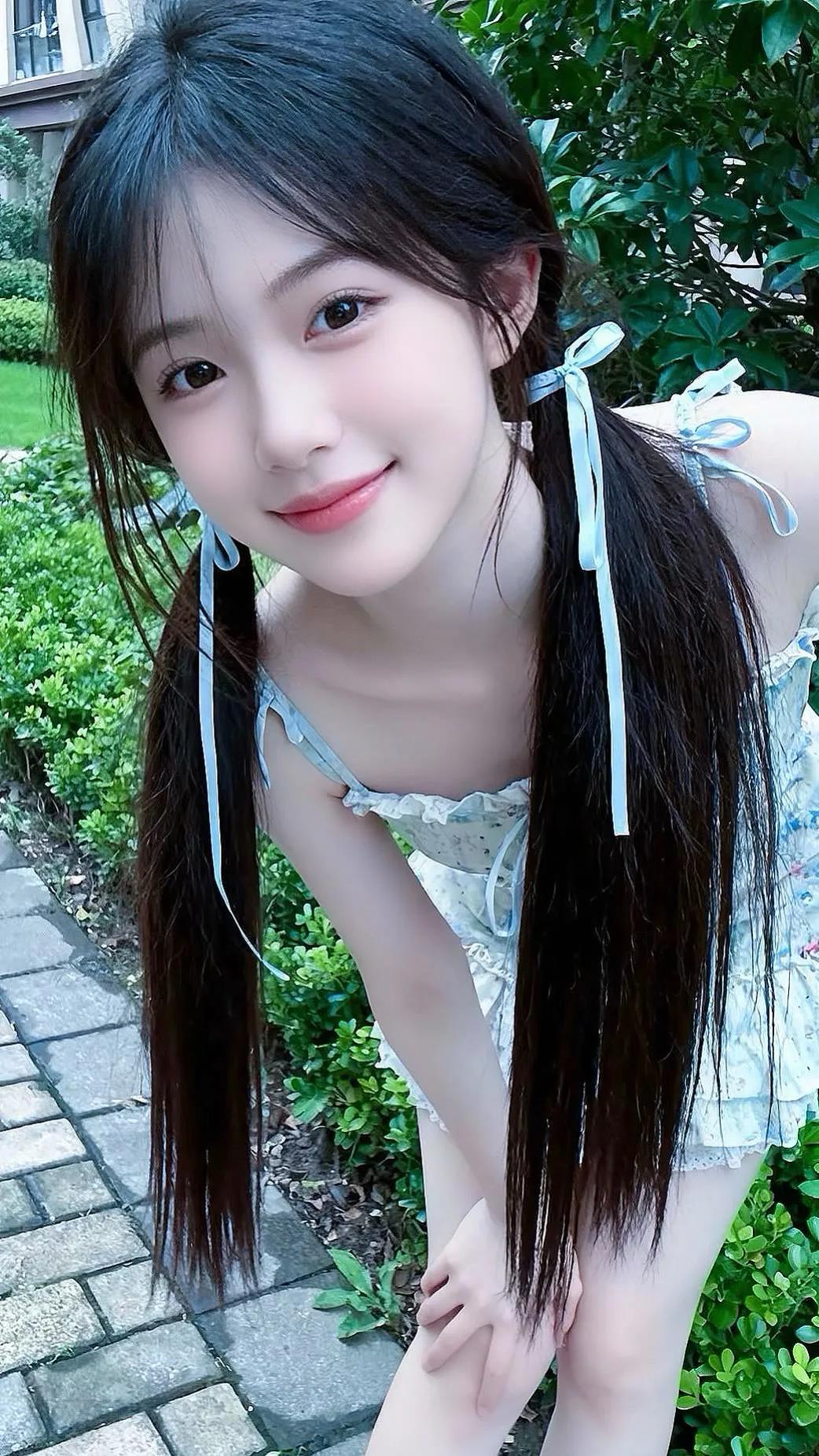夏日清新少女,微笑弯腰,绿意盎然背景,甜美可爱!🌿😊