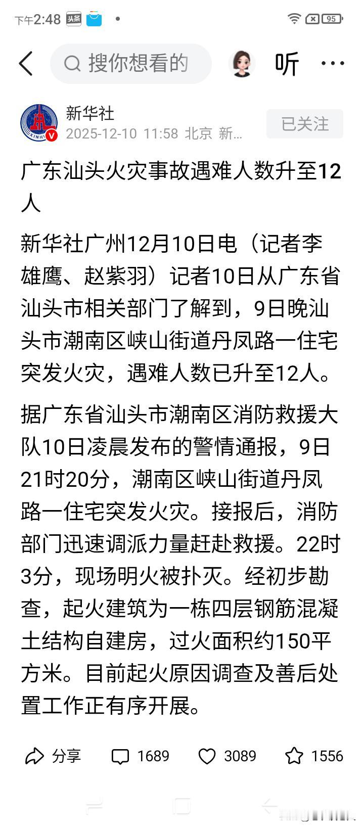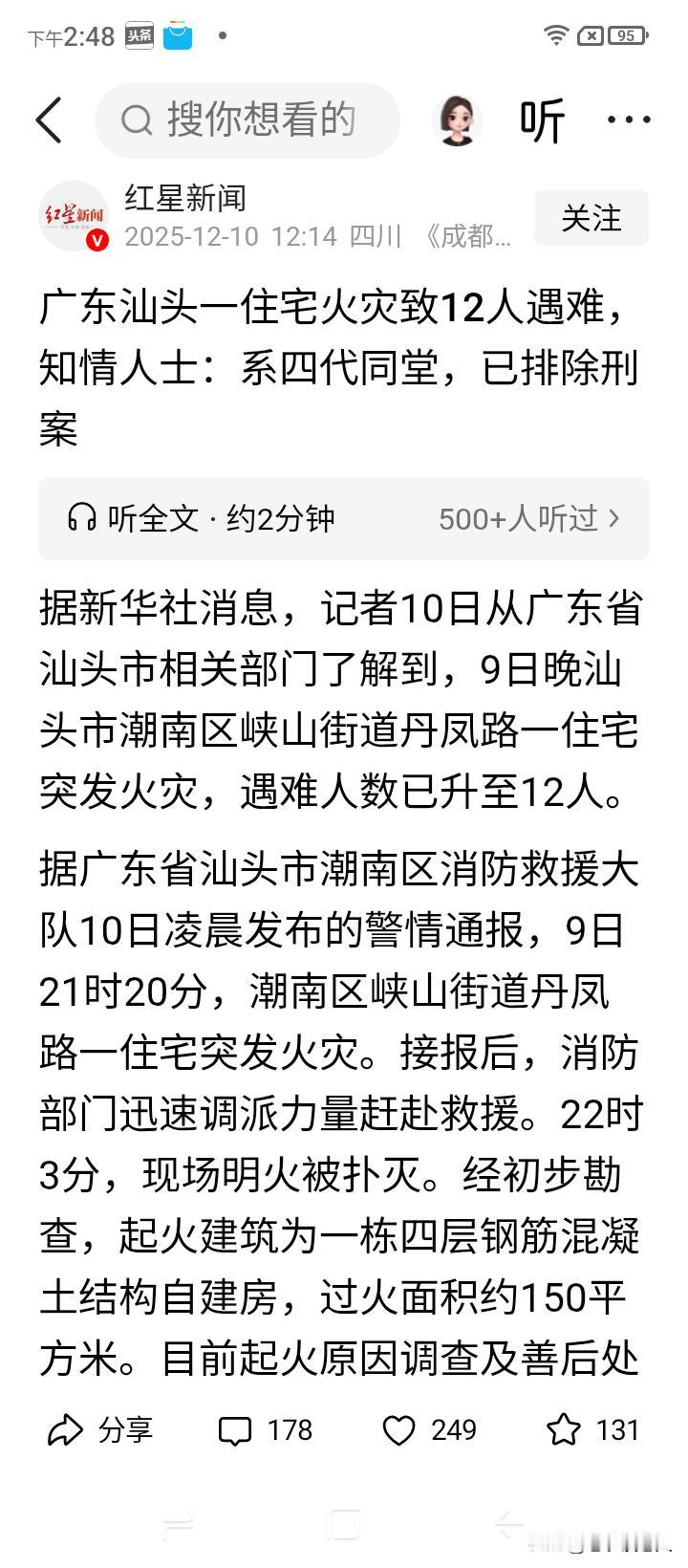 9日,广东汕头,潮南区峡山街道丹凤路,一户四层楼自建房,住宅火灾致12人遇难,据知情人士透露,一户系四代同堂人家,已经排除刑案的可能性,初步断定是电源起火而引起的。 据报道,起火住宅建筑,是一栋四层楼,钢筋混凝土结构的民用自建房,初步认定过火面积约为150平方米。 本次重大火灾遇难者全为一家人,四代同堂,多好的,幸福的一家人。据报道,火灾现场造成8人遇难,另外4人受伤送医院,送医4人已于凌晨在医院抢救无效死亡。 据报道,受灾者吴氏女儿说,遇难者全部都是自己的亲人,包括有父亲、母亲、奶奶,以及弟弟及其孩子等人,发生火灾的时候,哥哥不在家,仅有嫂子一人成功逃生,父母事发时与奶奶及其他人住在三楼和四楼,不知道他们是什么原因没跑出来。 寒冬季节,干旱少雨,草木枯黄,杂物干燥,着火点极高,只要有星星之火,就可以燎燃之势,一场火灾就会不期而至。 提醒广大市民和农村居民,一定要管控好火种,做到安全用电,注意室内室外抽烟和烟头的管理,防止住宅区和山林的火灾发生。 大火无情,安全用火势在必行,保护大众财产和生命安全,是头等大事,切不可掉以轻心,麻痹大意。 鸿蒙2025年度先锋体验广东汕头火灾遇难人数升至12人高层住宅楼火灾