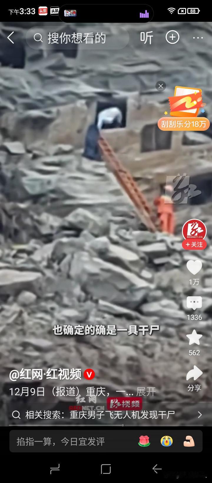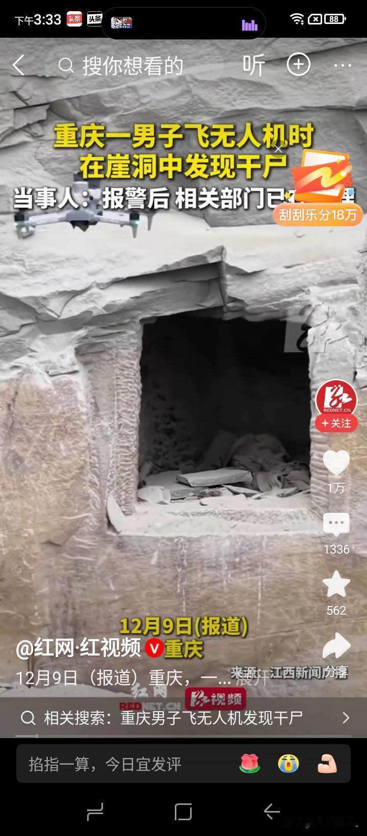 据媒体报道,12月9日重庆一男子无人机爱好者,在大山深处的悬崖峭壁上飞行,无人机发现,石洞里面有一具多年的干尸,有毛毯,衣服,矿泉水瓶等等日常生活用品。该男子发现后第一时间选择报警,警方一个小时后赶到,对现场勘察,取证,进行了适当的必要的处理。 据本地人反映,这个大山深处,悬崖峭壁上有几个人为的开发的石洞,过去经常有游人攀爬上去游玩和露营,是理想的露营和躲雨的最佳之处。 该地山青水秀,景色宜人,风景绝佳,近年来吸引了许许多多的摄影爱好,无人机爱好者,喜欢游山玩水,登山的朋友,来到这里游玩。 但是,来到此山洞的这位死者,究竟是何方人士?究竟是何原因死在这里?暂且无人知晓。据人们推测猜想,可能是多年前一个来此山游玩的旅游者,也可能是来此山中我要的采药者。 因此,本人认为,无论来到这样大山深处的深山老林中,采药、伐木、探险、游玩和拍照,记住千万不要独来独往,一定要三五成群的进入山林,避免危险的发生。