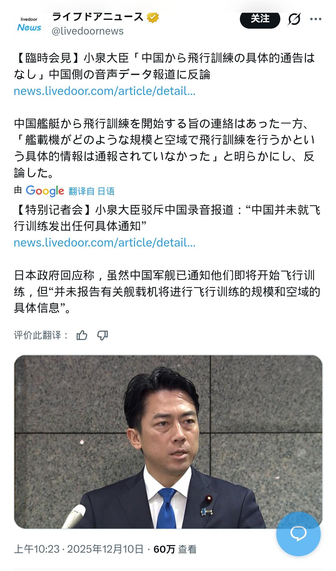 小泉又改口了! 按时间顺序,我们来回顾日本防卫大臣小泉三变的变脸历程: 第一阶段(=第一次解释):“中国方面事先没有通知我们。 >声明的要点是,没有通知说训练已经开始, 第二阶段(=音频发布之后):“我们并不知晓事先有任何航行警告报告。.. >坚持否认该报告的存在。 第三阶段(=这次是特别新闻发布会):我们已接到通知,飞行训练即将开始。然而,目前尚无关于训练规模或空域的具体信息。 >论点来到“有一份报告,但必要的细节尚不清楚” 果然,这偿还政治贵公子,绝对是家喻户晓的巨婴! source: X
