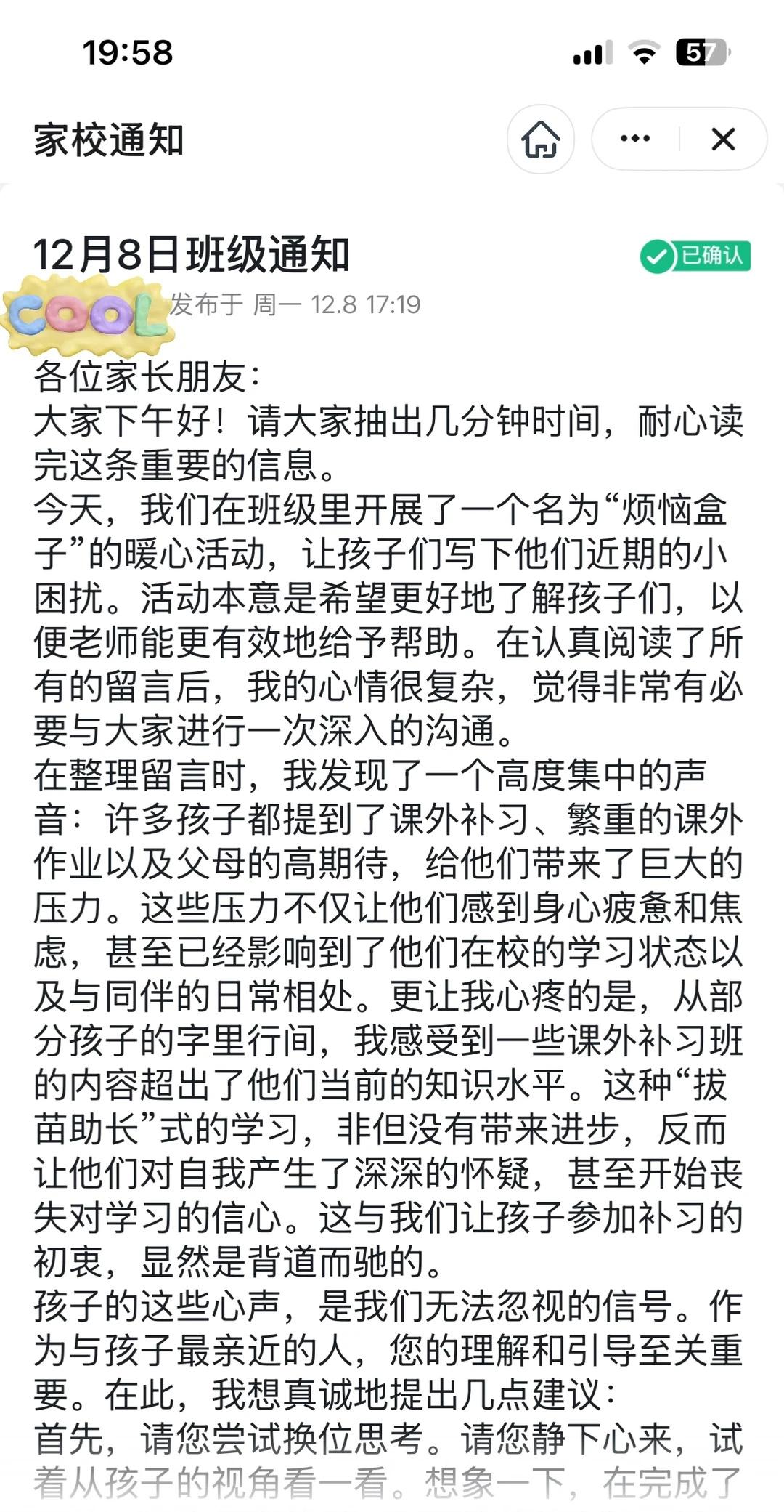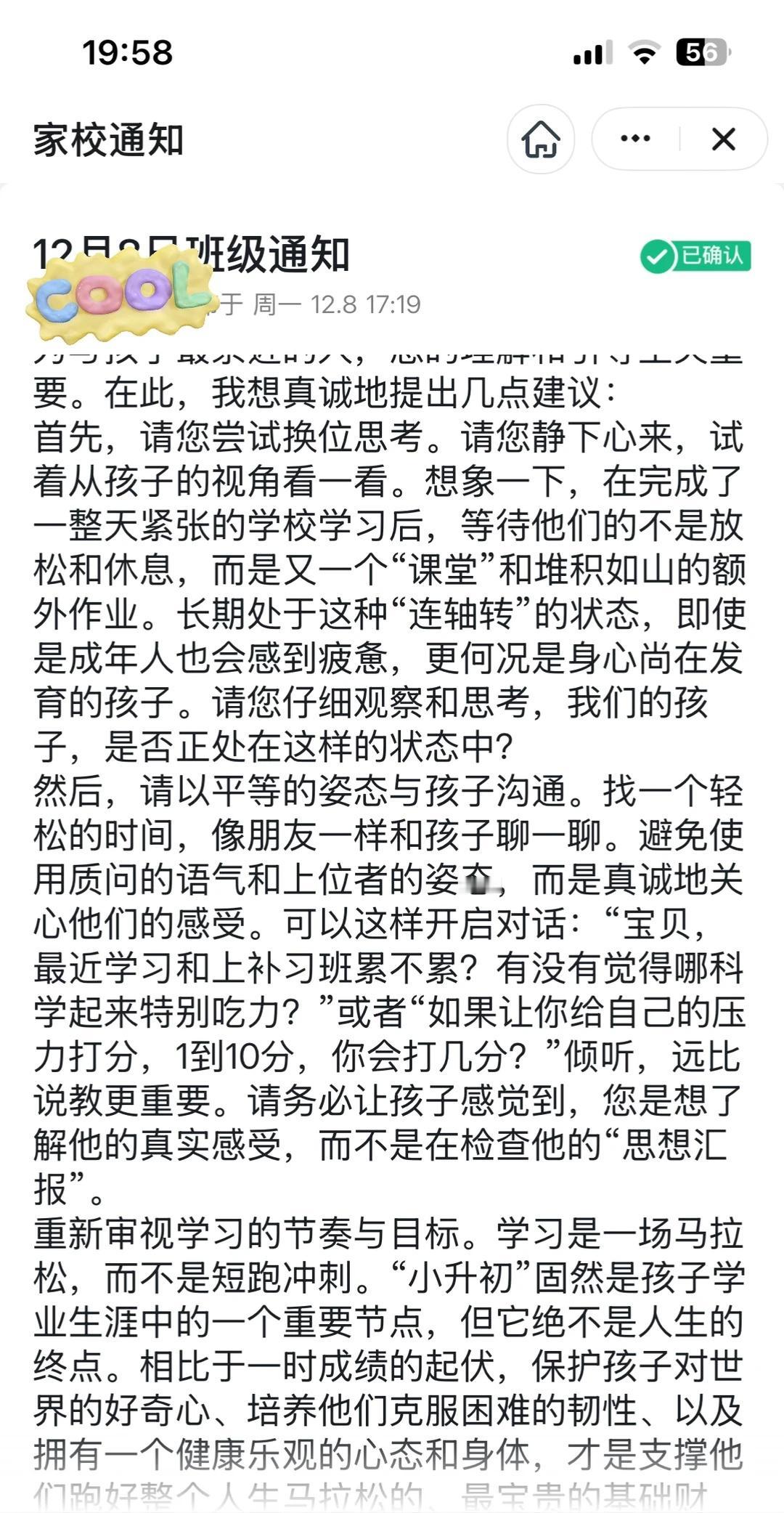 赢了XSC,难道就是未来的赢家? 今天班主任在群里发来这样的消息,看完以后,我认为我和老师的想法十分同频。 曾经我也是盲目跟风,鸡娃学奥数,抓了两年奥数,导致孩子怀疑自己是不是真的脑子不管用,非常抵触数学。于是我果断做出决定,放弃奥数,回归校内抓基础。随着时间的推移,我发现放弃奥数之后孩子对数学又重拾了信心。校内数学目前都在90➕。而且每周周末带孩子去户外活动,参加体育锻炼,而非把所有时间拿来去刷题。就像老师说的,学习是一场马拉松,不是百米冲刺。相比孩子的成绩,我认为健康的心理,强大的抗压能力才是最重要的。并不是为了XSC让孩子在童年留下遗憾,只顾着刷题,刷题,再刷题。奥数是留给那些%1的天赋型选手,不是靠刷题和勤奋题成绩,这种是假象,是暂时的。 条条大路通罗马,天不生无用之人,地不长无用之草。一定要理性看待奥数。而不是把它拿来当作孩子人生的跳板,拔苗助长! 记得刚上一年级时候,班里的娃娃各个都是眼里带着光,随着学业越来越重,家长给的压力越来越大,一部分准备XSC孩子真的看起来很疲惫,眼里也没有光了。根据孩子自身条件来选择,而不是盲目跟风,被机构洗脑。最后损失钱财是次要的,损失了孩子的心理健康才是主要的。