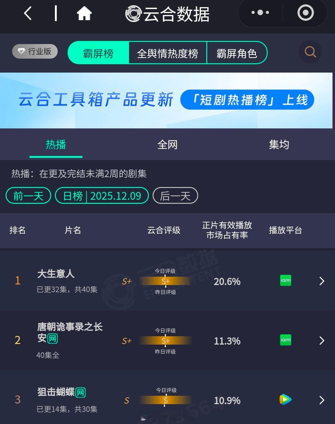 云合 大生意人20.6%狙击蝴蝶10.9%任嘉伦《风与潮》首播开2.6%