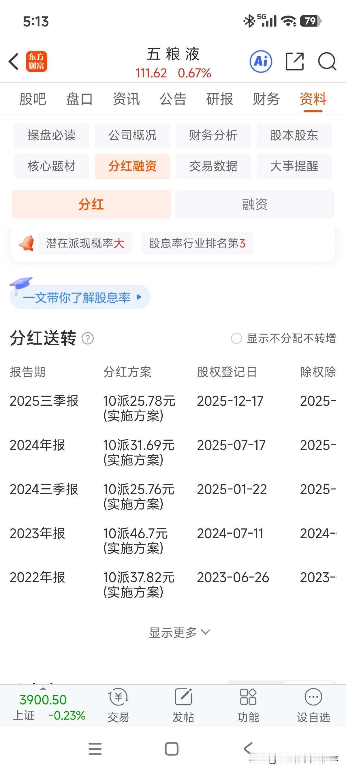中期分红来了[呲牙]!今天只剩一成现金仓位,下周二可以收到伊利股份股息,周三五粮液股息可以到手,又可以增加现金量了! 今年五粮液分红比24年明显提前,另外当前市值4332亿除权100亿后,只有4232亿,按年200亿分红计算,股息率4.7%! 不去盲目猜底在哪?但这估值又不是重仓,仍可以佛系看待股价涨跌,除权后市值在4200亿以内会选择复投!