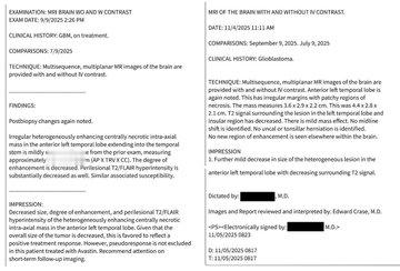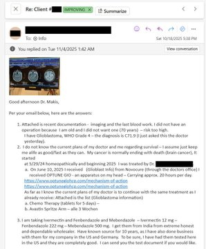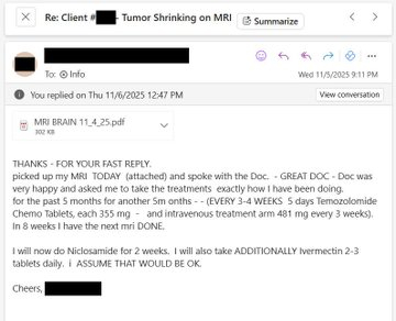 最新文章:伊维菌素和甲苯咪唑治疗见证——一位69岁的肯塔基州胶质母细胞瘤患者在接受该方案治疗12个月后分享了他的经历一个历时12个月的胶质母细胞瘤成功治疗案例!! 😃(肿瘤科医生没有这些)故事:一名69岁的肯塔基州男子被诊断出患有4.5厘米的胶质母细胞瘤2024年10月,他开始了:伊维菌素 2mg/kg/天甲苯咪唑 1500 毫克/天CBD油 75毫克/天2025年1月,他开始:伊维菌素 2mg/kg/天甲苯咪唑 2000 毫克/天芬苯达唑 1000 毫克/天CBD油 100毫克/天过去12个月里,他的脑瘤持续缩小!核磁共振成像(MRI)是从右向左解读的。医生非常高兴,并让我继续按照之前的方式接受治疗。胶质母细胞瘤很难治疗,所以看到胶质母细胞瘤在12个月内逐渐缩小,真是太不可思议了!NEW ARTICLE: IVERMECTIN and MEBENDAZOLE Testimonial - 69 year old Kentucky man with Glioblastoma reports after being on Protocol for 12 monthsA 12 month Glioblastoma success story!! 😃(Oncologists don't have these)STORY:69 year old Kentucky man with a 4.5cm GlioblastomaIn October 2024 he Started:Ivermectin 2mg/kg/dayMebendazole 1500mg/dayCBD Oil 75mg/dayIn January 2025 he started:Ivermectin 2mg/kg/dayMebendazole 2000mg/dayFenbendazole 1000mg/dayCBD Oil 100mg/dayHis brain tumor has consistently shrunk over the past 12 months!! The MRIs are read right to left"Doc was very happy and asked me to take the treatments exactly how I have been doing"Glioblastoma is not easy to deal with so to see a shrinking Glioblastoma over a course of 12 months is incredible!!