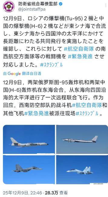 日本防卫省统合幕僚监部昨晚(12月9日晚)写道:“12月9日,两架俄罗斯图-95轰炸机和两架中国(H-6)轰炸机在东海会合,从东海向四国沿海的太平洋进行了一次远程联合飞行。作为回应,紧急出动了航空自卫队西南航空方面队等战斗机。” 12月9号这天,东海空域挺热闹。两架俄罗斯的图-95轰炸机和两架中国的轰-6轰炸机在这儿碰了头,之后一起往四国沿海的太平洋方向飞去,完成了一次远程联合飞行。 日本那边反应挺快,航空自卫队西南航空方面队的战斗机紧急升空,跟上了。 其实这事儿不算新鲜,中国国防部12月10号就说了,这是中俄两国空军的第10次联合空中战略巡航,早就列在年度合作计划里了。 说白了,就是两国军队早就定好的安排,不是临时起意搞出来的动作。 外交部也跟着回应,说这是为了展示应对地区安全挑战、维护和平稳定的决心,没别的意思。 参与巡航的这两款轰炸机都是老熟人了,轰-6是咱们空军的远程打击主力,改进型的性能越来越强,能挂远程导弹,还能空中加油,飞得又远又有威慑力。 俄罗斯的图-95更是老牌战略轰炸机,续航能力超强,是俄军远程巡航的常客。 这次两者配合,在国际空域按既定航线飞行,全程都守着国际法,没进任何国家的领空。 日本每次遇到这种情况都会出动战机,这几乎成了惯例,去年11月第九次巡航的时候,日本航空自卫队就派了战机跟踪,这次不过是重复了之前的操作。 但有专家觉得,没必要过度解读这种反应。中俄从2019年第一次联合巡航到现在,十年间搞了十次,次次都是公开透明的例行训练,从来没针对过第三方。 这种联合巡航的意义其实挺实在的,一方面能练部队的协同能力,毕竟两国战机要在远海空域配合行动,通信、导航这些都得磨合到位。 另一方面也是在传递信号,东北亚这地方安全局势复杂,中俄联手能多一分稳定力量。 有军事专家提到,要是真有防御需求,这种空中巡航和海军航母编队配合起来,战斗力会更实在,但这次跟辽宁舰的远海训练就是个巧合。 总的来看,这就是一次计划内的军事合作行动,跟“威胁”根本不搭边。 国际空域本来就是各国都能合法使用的地方,中俄按规矩飞行,其他国家实在没必要大惊小怪。 以上都是个人观点,对此您有什么不同的看法,可以在评论区留言讨论!!!
