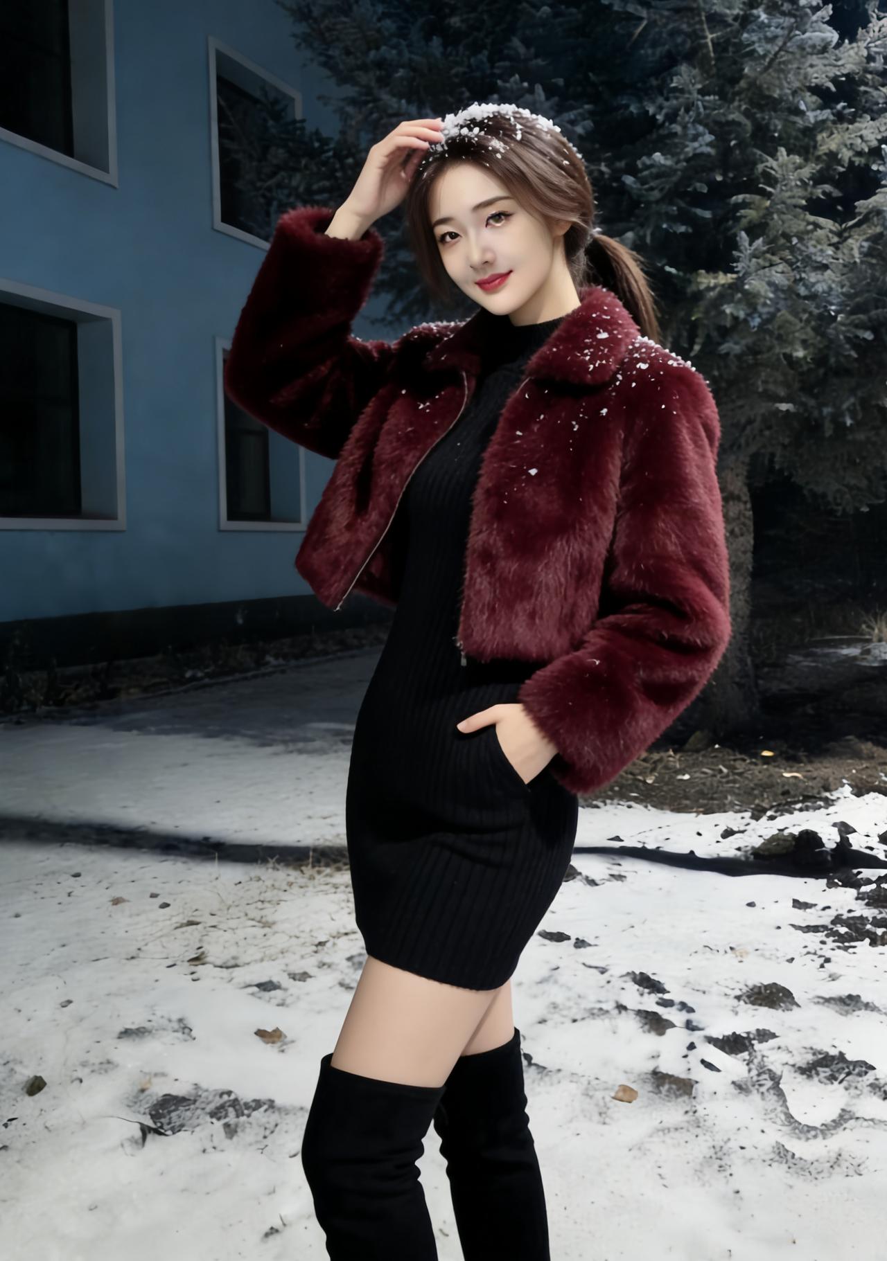 雪粒落在酒红的毛领上 像星星碎在了柔软的草丛里 她抬手拂开额角的银屑 指尖碰落的,是冬的絮语 ~ 蓝墙是冷调的背景板 松枝结着冰,却藏不住暖意 皮草裹着的风,都软了 黑色裙裾裁开雪地的白 ~ 一步,是雪的吱呀 再一步,是红与黑的交响 她把冬装成了首饰 鬓边的雪,是最亮的星钻 ~ 夜色漫上来时 她站成一幅流动的画 红裘是燃烧着的火 在雪地里,灼出温柔的疤。