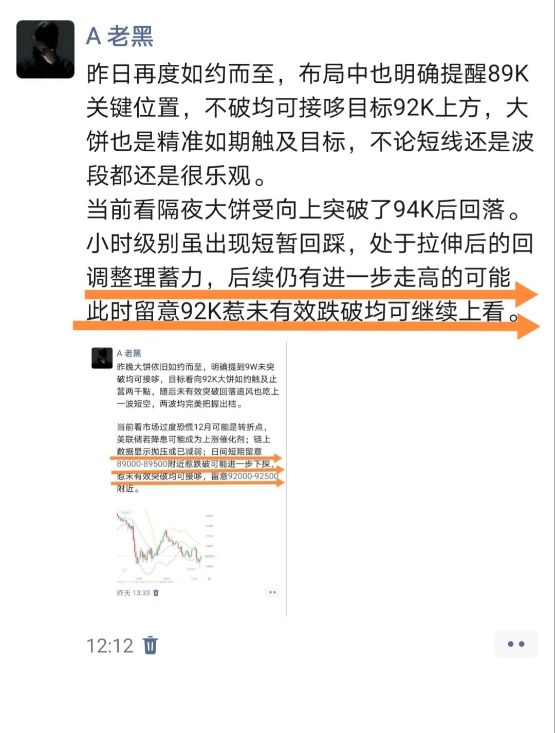 昨晚大饼依旧如约而至,明确提到9W未突破均可接哆,目标看向92K大饼如约触及止营