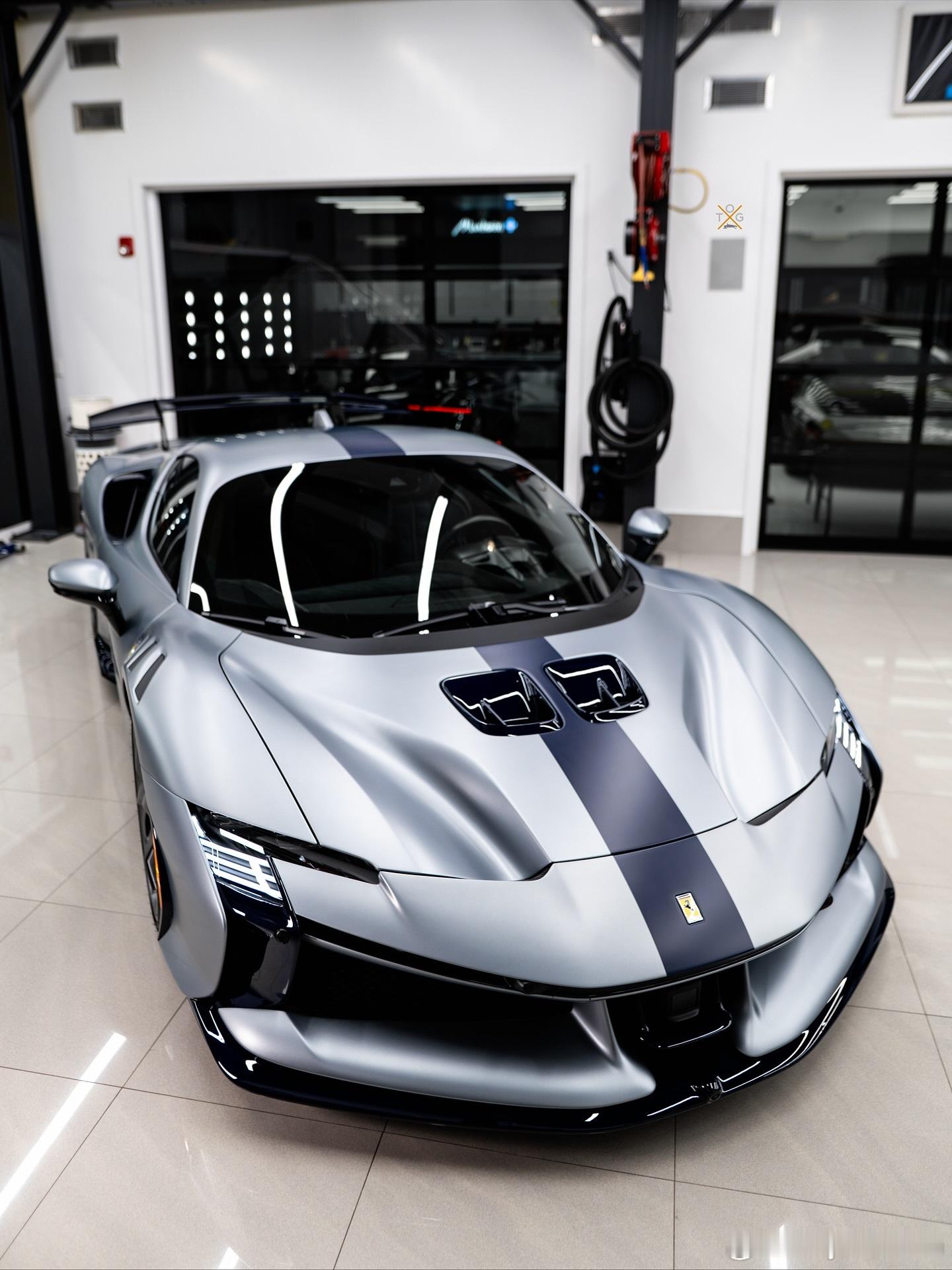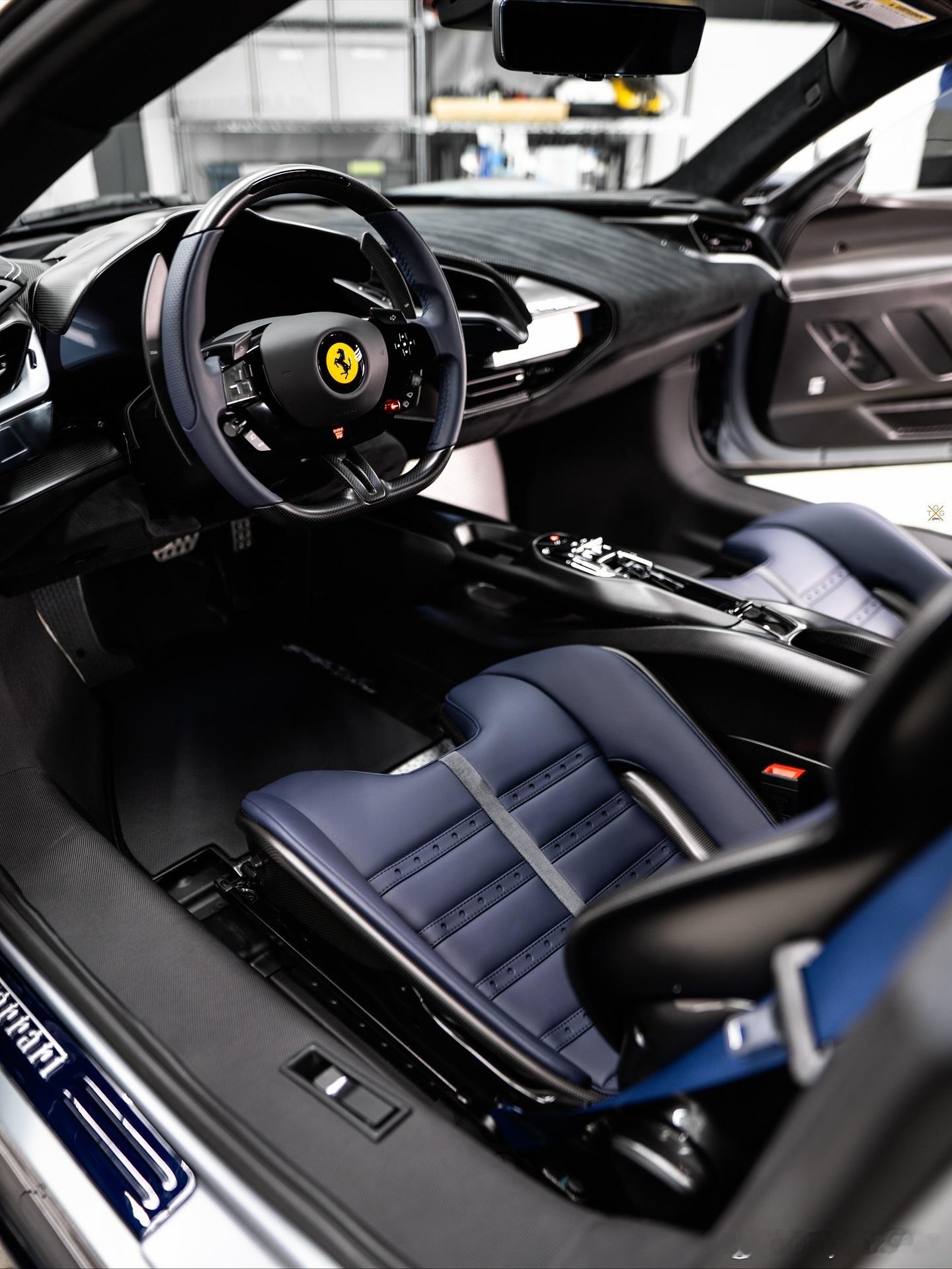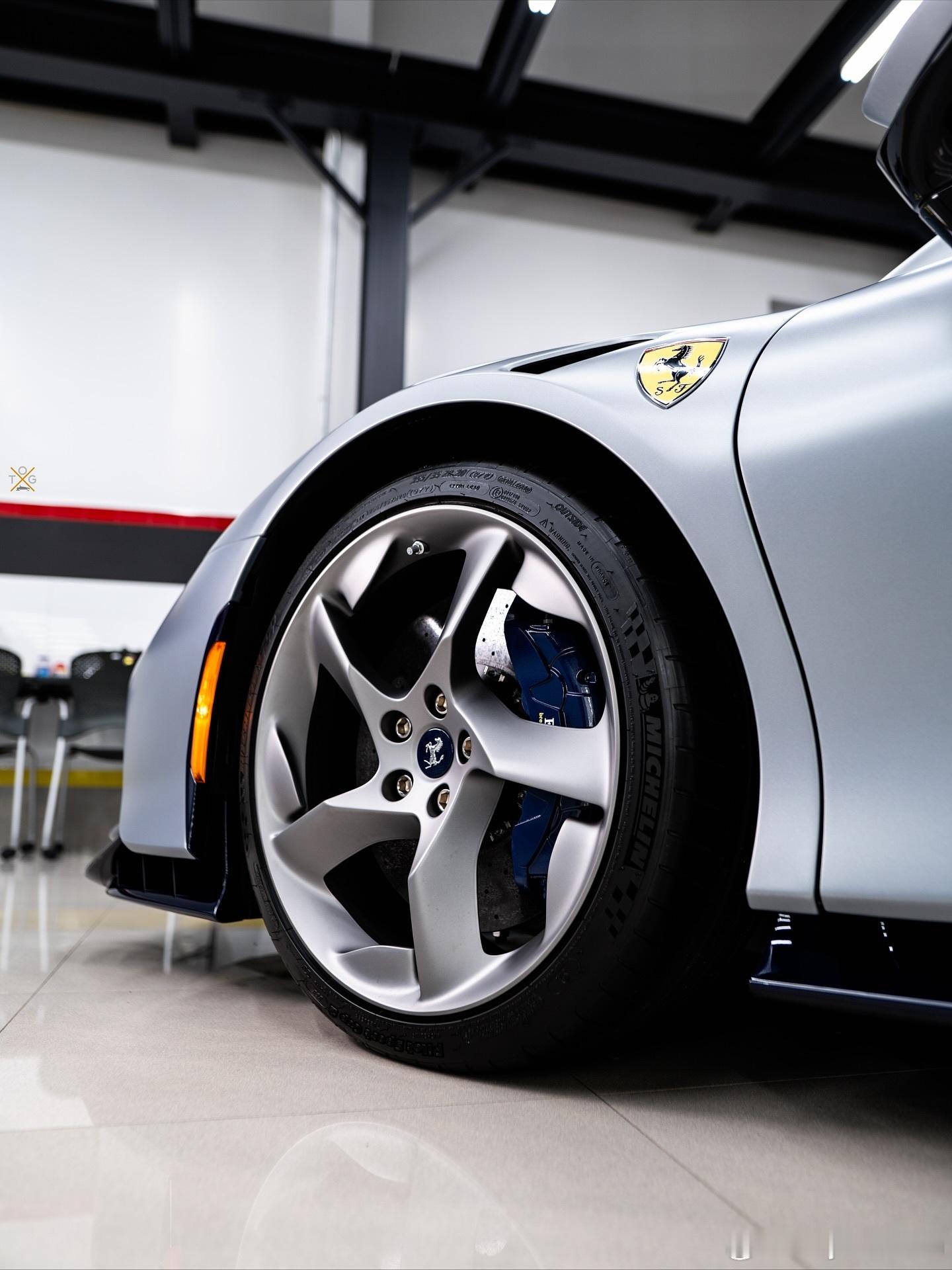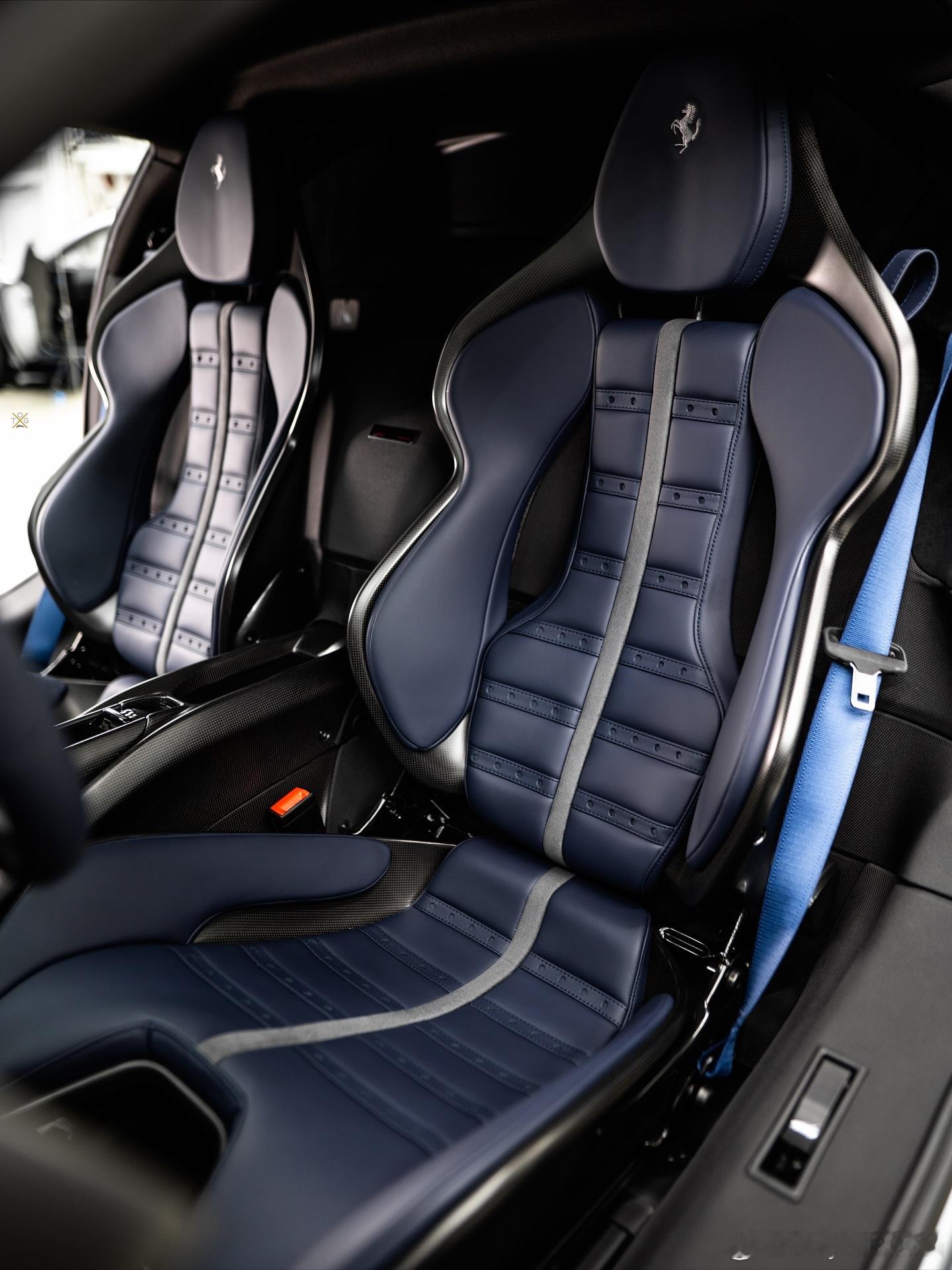 外观配色为Grigio Titanio Opaco,搭配哑光化的蓝色长赛车拉花,外观方面还选择了哑光银色的赛车轮毂,上色车顶以及深蓝色刹车卡钳,车身外侧的碳纤维部件均被替换成了蓝碳,这也是这台SF90 XX可以成为Tailor-made的主要原因。内饰方面,Daytona复古赛车座椅同样使用了海军蓝色的皮革。交付于位于美国康州格林威治的Miller Motorcars,一台很低调的Tailor-made作品。图片来自