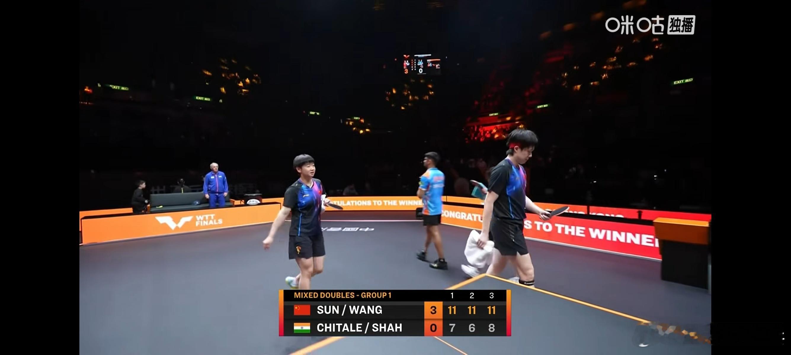 王楚钦孙颖莎vs沙奇塔莱 2025WTT香港总决赛混双第一阶段循环赛第一组:王楚钦/孙颖莎3-0玛纳什·沙/奇塔莱,比分:11-7,11-6,11-8。