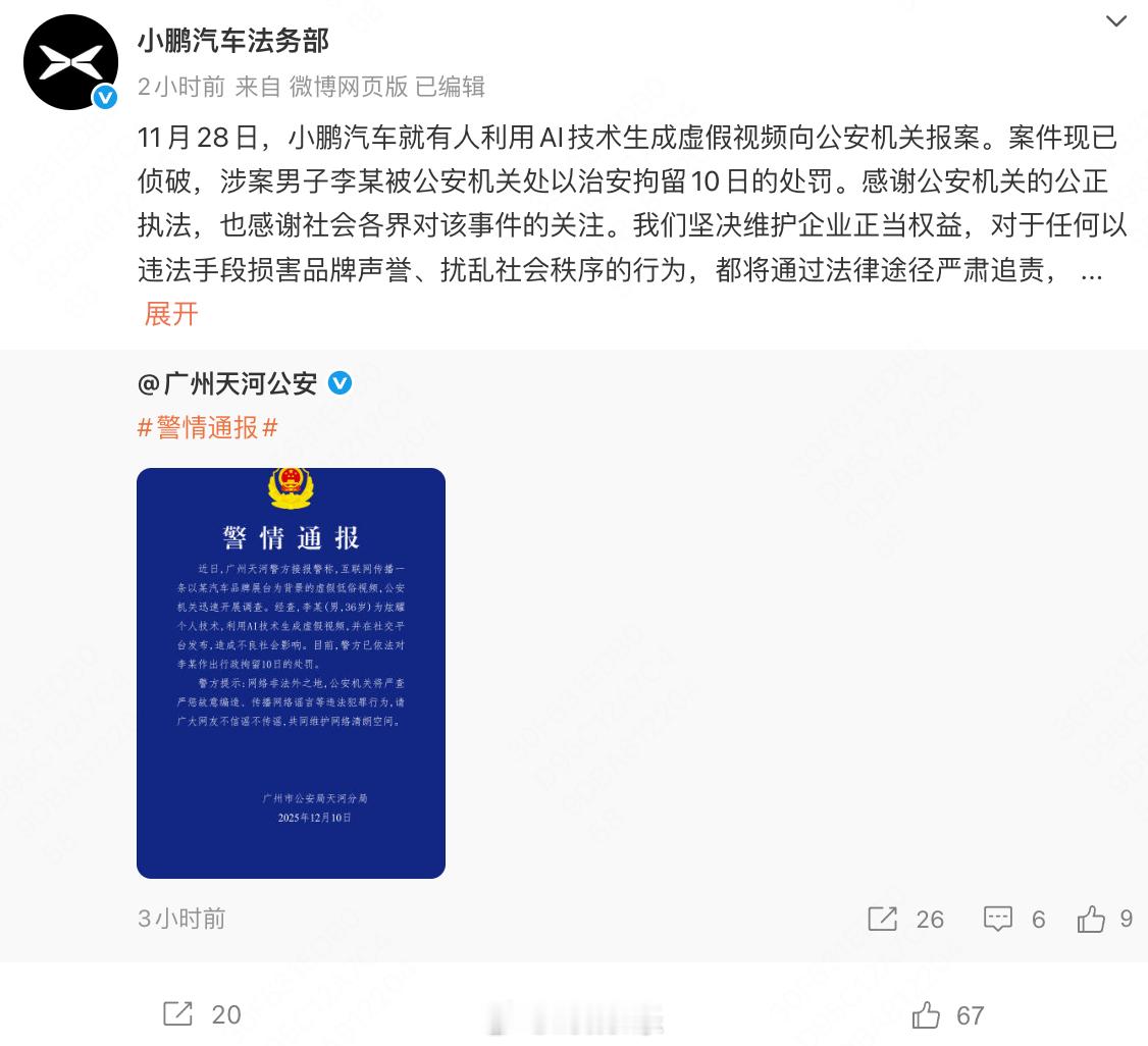 上次有人用AI生成的不雅视频案告破了,拘留10天!AI是一项新技术没错,但是传播AI内容一定要考虑社会影响,谨记要守法!广州车展AI视频造假者被警方抓获小鹏展台AI视频造假者已被拘留