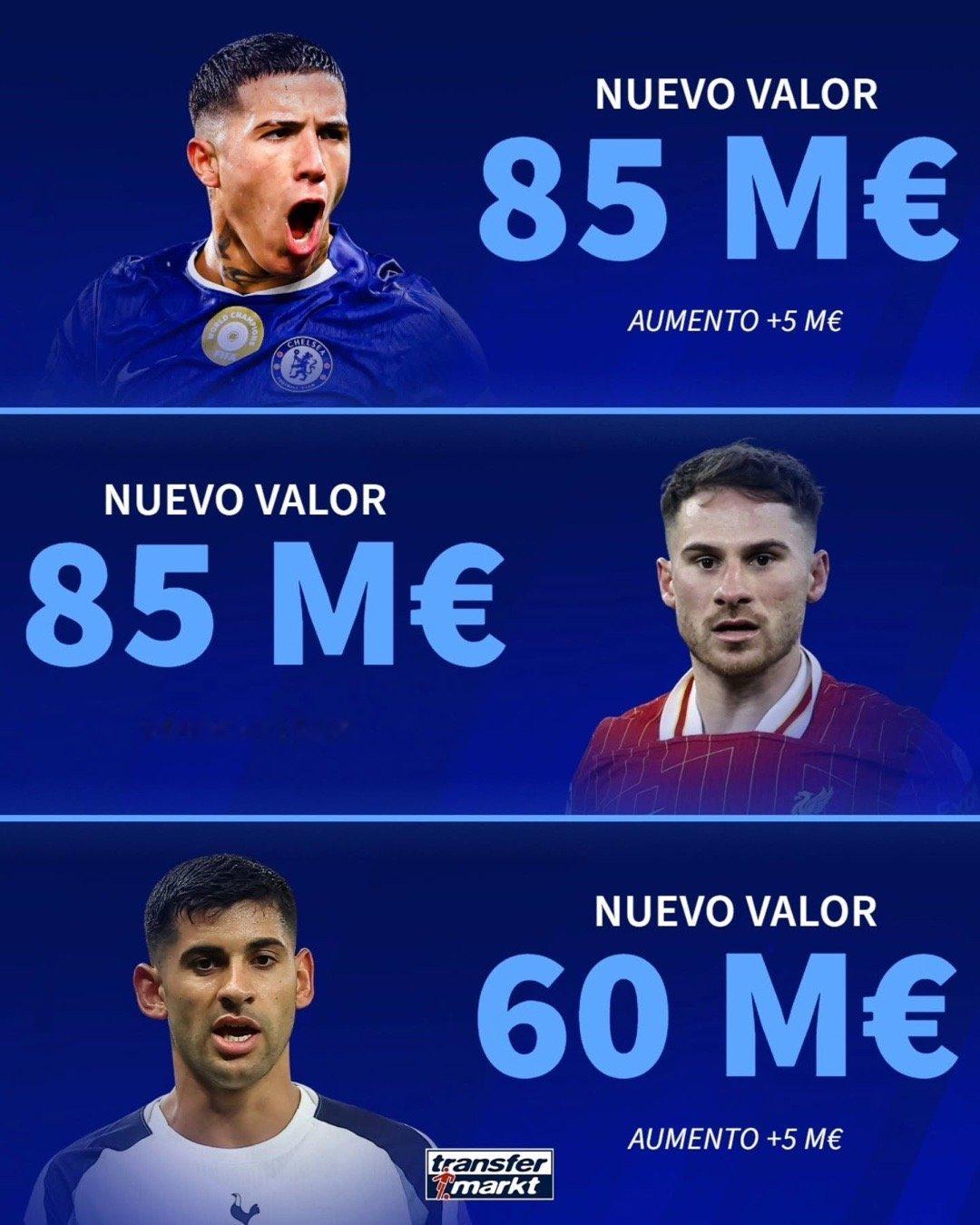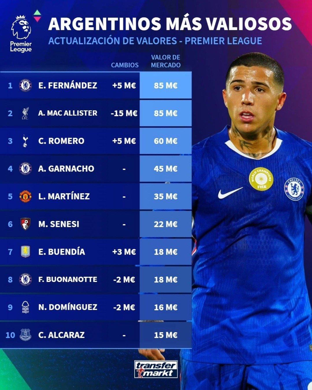 📈德转更新了效力于英超的阿根廷球员的身价:恩佐稳中小涨500万欧麦卡利斯特从1亿欧元跌至8500万欧库蒂罗梅罗处于历史最高报价边缘恩佐费尔南德斯克里斯蒂安罗梅罗麦卡利斯特关注阿根廷球员