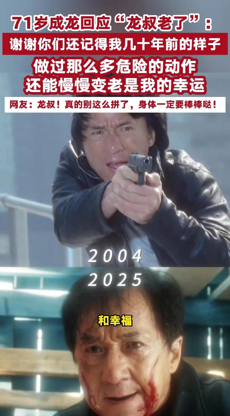 谁能想到,那个在银幕上永远不知疲倦、拿命搏杀的“拼命三郎”,如今也到了需要观众“原谅”老去的年纪? 这次新片宣传,71岁的他一句话,直接戳中了我的泪点。 说实话,看着大银幕上的他慢慢变老,心里真不是滋味。几十年了,我们习惯了看他上天入地,习惯了他用身体为我们带来欢笑和震撼。这次他哽咽着说:“谢谢你们还记得我几十年前的样子……能慢慢变老是我的幸运。”听到这儿,我真的绷不住了。 以前只觉得他是打不死的英雄,现在才明白,英雄也是血肉之躯。那些年为了镜头完美,留下的满身伤病,只有他自己最清楚。如今他还能笑着站在我们面前,这本身就是一种奇迹。 岁月不饶人,但成龙大哥饶了我们。 他用几十年的光阴,为我们演绎了什么是敬业,什么是热爱。现在的他,不需要再证明什么,只要健健康康的,就是我们最大的福气。