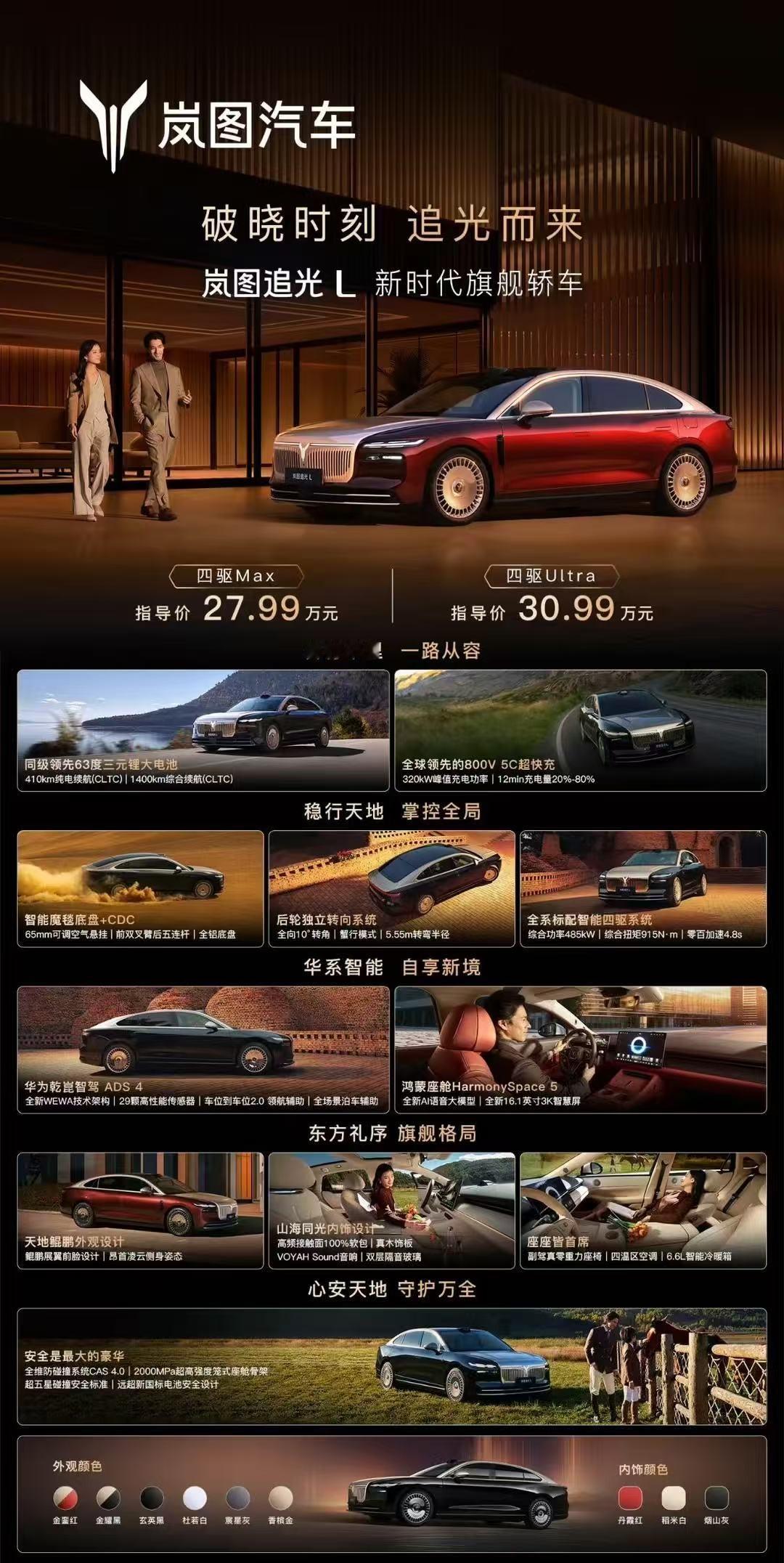 岚图追光L出价格啦,Max版27.99万元,Ultra版30.99万元。车漆给了六个,其中有两个拼色,大饼轮毂好看,中间的标还是悬浮的。 动力这块儿,全域800V、63度电池、5C超充,纯电续航410公里,综合续航1400公里。 配置说说差异,Max版华为全家桶、车载冷暖箱、零重力座椅都给了。 Ultra版在这基础之上,价格多了三万,但空悬、魔毯底盘+CDC、双主动降噪、后轮转向这些配置就都给配齐了。【来自懂车帝车友圈】