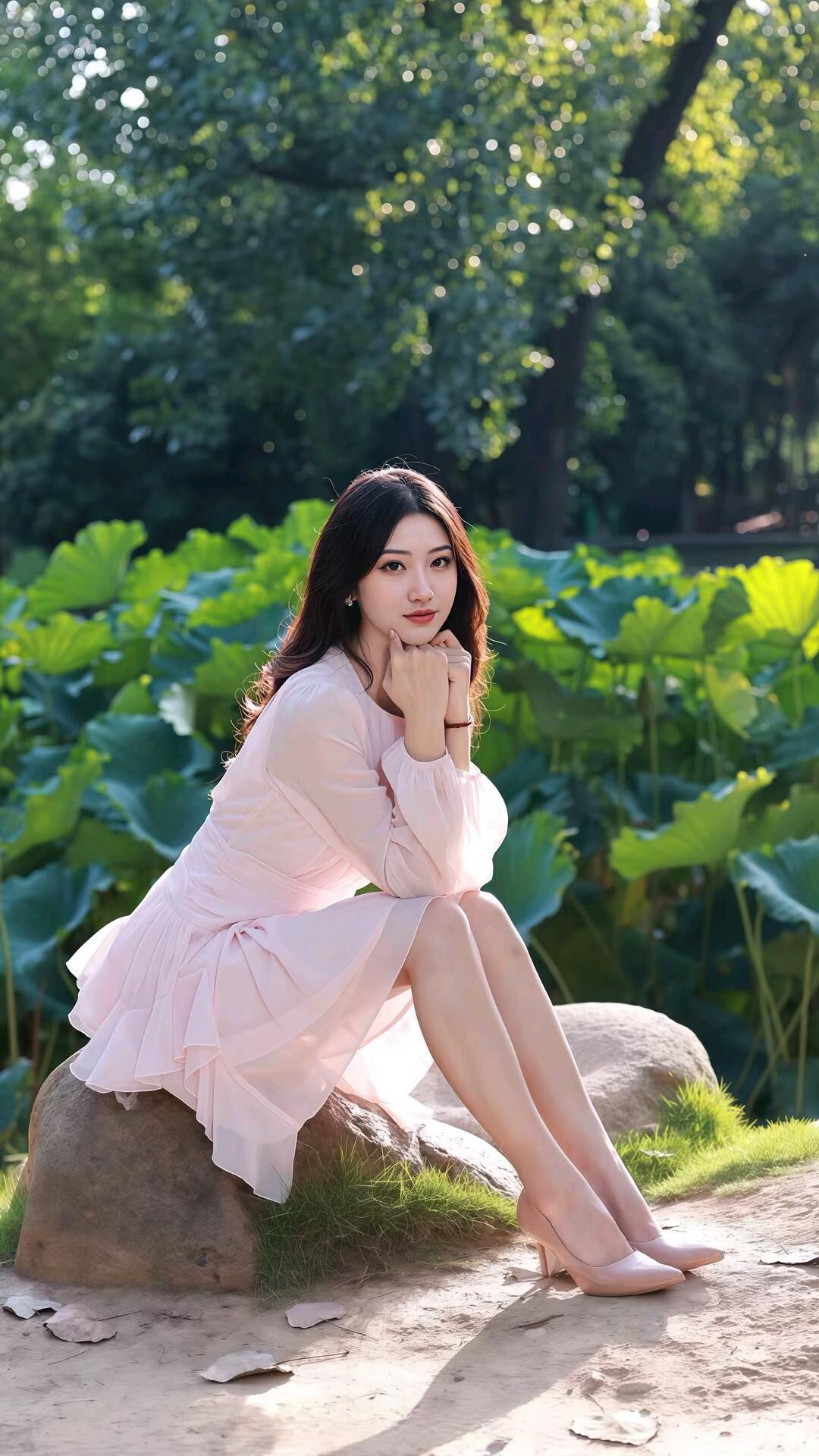 在阳光明媚的公园里,优雅的少女坐在石头上,享受着宁静的时光。_