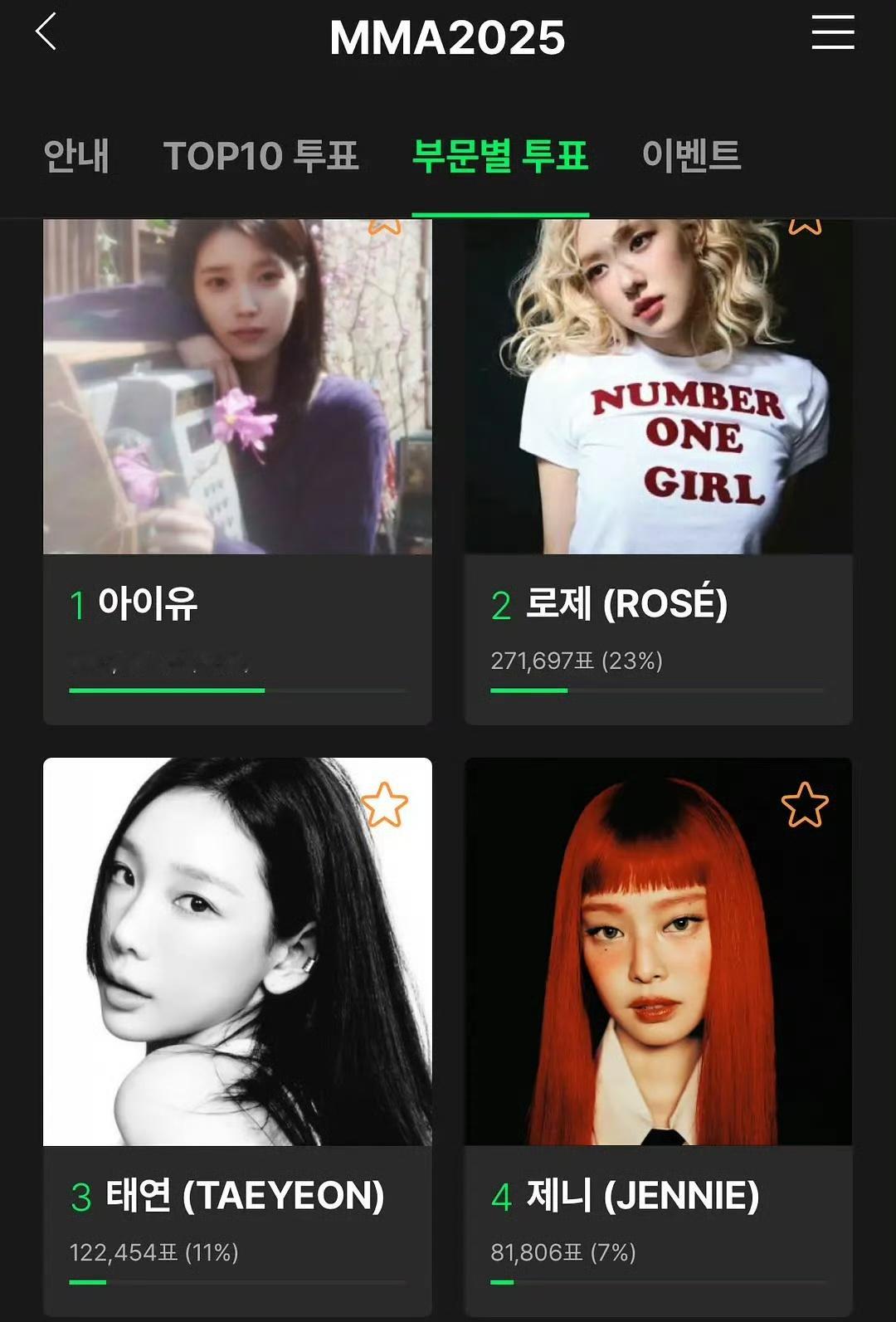 Jennie 粉丝真丢lian,被没有组织投票的朴彩英超过。。。总有千奇百怪的借口挽尊,到时候现场得不到奖或者偷|别人奖吗?
